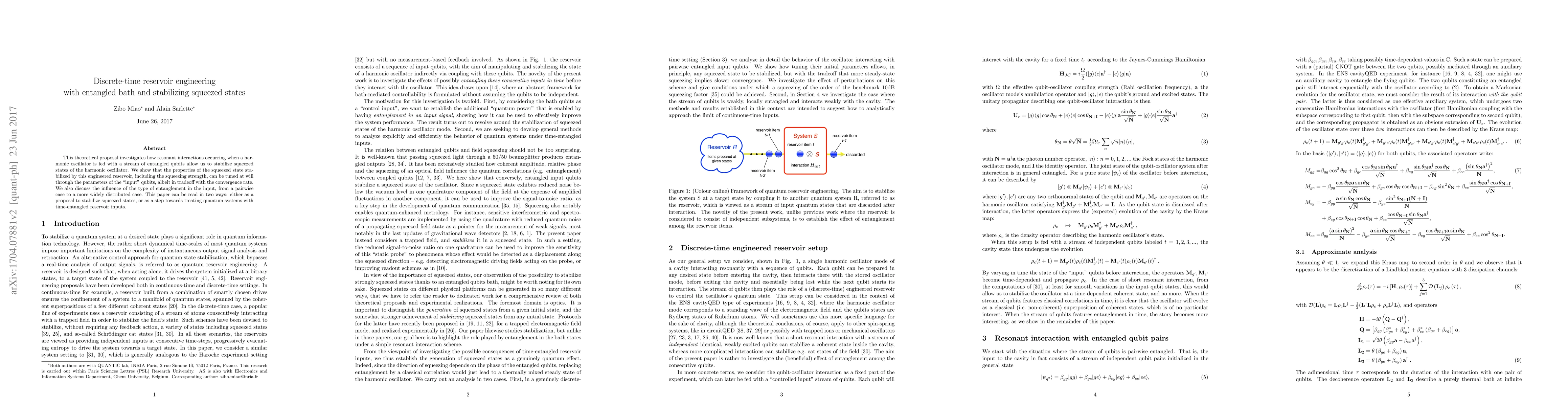 This theoretical proposal investigates how resonant interactions occurring when a harmonic oscillator is fed with a stream of entangled qubits allow us to stabilize squeezed states of the harmonic oscillator. We show that the properties of the squeezed state stabilized by this engineered reservoir, including the squeezing strength, can be tuned at will through the parameters of the "input" qubits, albeit in tradeoff with the convergence rate. We also discuss the influence of the type of entanglement in the input, from a pairwise case to a more widely distributed case. This paper can be read in two ways: either as a proposal to stabilize squeezed states, or as a step towards treating quantum systems with time-entangled reservoir inputs.