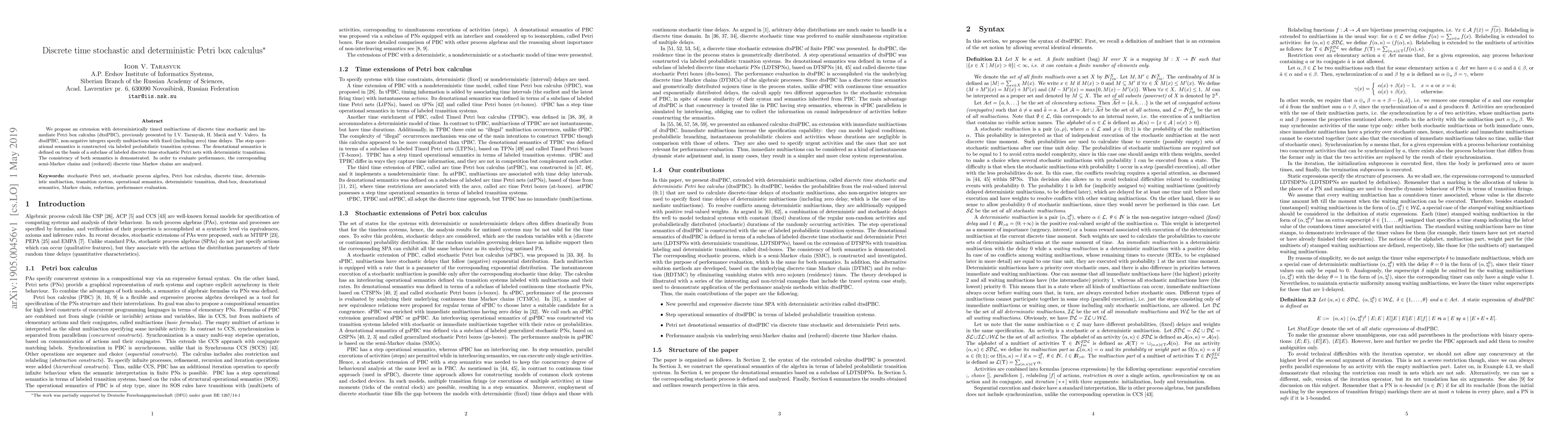 We propose an extension with deterministically timed multiactions of discrete time stochastic and immediate Petri box calculus (dtsiPBC), previously presented by I.V. Tarasyuk, H. Maci\`a and V. Valero. In dtsdPBC, non-negative integers specify multiactions with fixed (including zero) time delays. The step operational semantics is constructed via labeled probabilistic transition systems. The denotational semantics is defined on the basis of a subclass of labeled discrete time stochastic Petri nets with deterministic transitions. The consistency of both semantics is demonstrated. In order to evaluate performance, the corresponding semi-Markov chains and (reduced) discrete time Markov chains are analyzed.