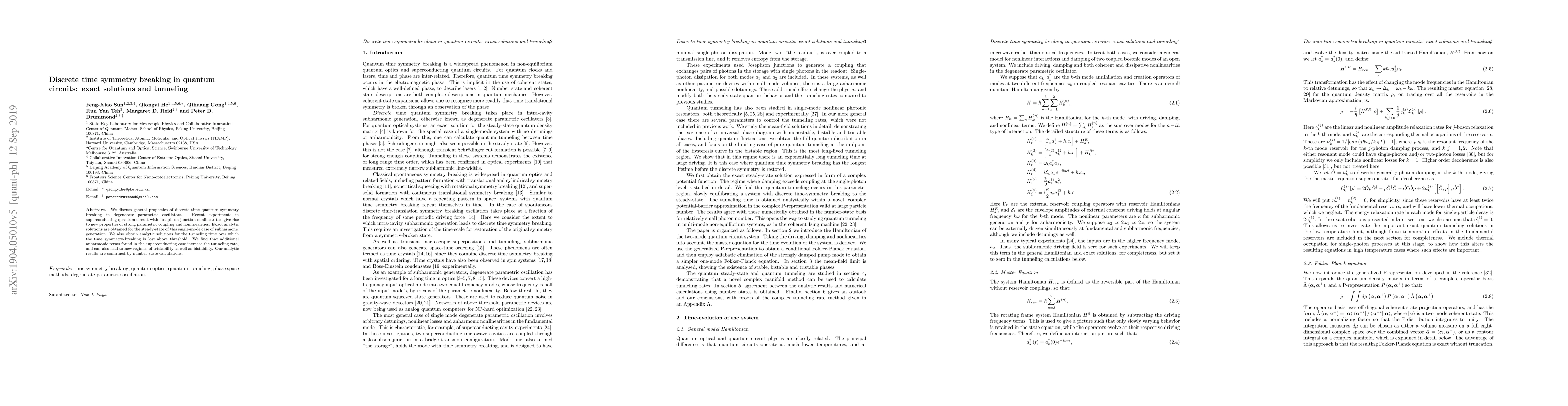 This paper explores discrete time symmetry breaking in quantum circuits, focusing on degenerate parametric oscillators in superconducting circuits. It provides exact analytic solutions for steady-state subharmonic generation and tunneling time, revealing that anharmonic terms enhance tunneling rates and introduce new regimes of tristability and bistability, confirmed by number state calculations.