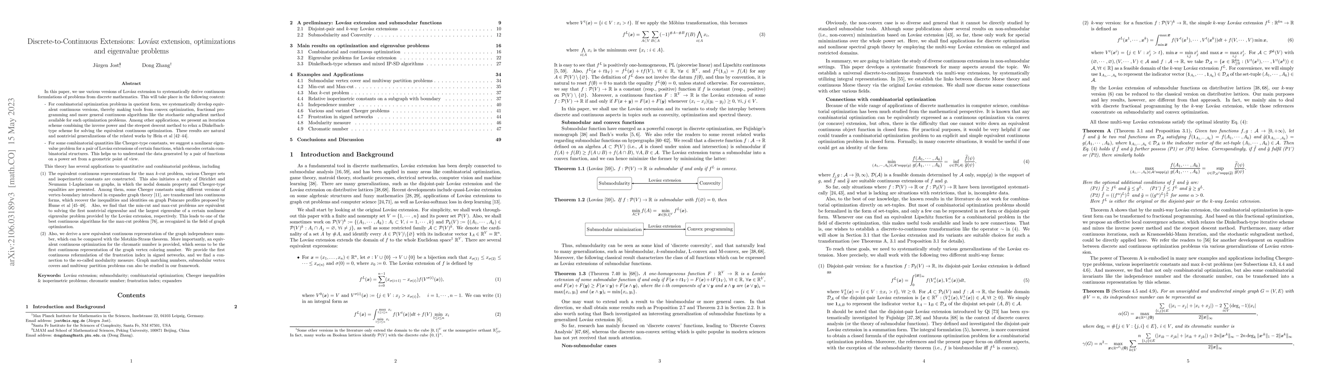In this paper, we use various versions of Lov\'asz extension to systematically derive continuous formulations of problems from discrete mathematics. This will take place in the following context: (1) For combinatorial optimization problems in quotient form, we systematically develop equivalent continuous versions, thereby making tools from convex optimization, fractional programming and more general continuous algorithms like the stochastic subgradient method available for such optimization problems. (2) For some combinatorial quantities like Cheeger-type constants, we suggest a nonlinear eigenvalue problem for a pair of Lov\'asz extensions of certain functions, which encodes certain combinatorial structures. This theory has several applications to quantitative and combinatorial problems, including: (a) The equivalent continuous representations for the max $k$-cut problem, various Cheeger sets and isoperimetric constants are constructed. This also initiates a study of Dirichlet and Neumann 1-Laplacians on graphs, in which the nodal domain property and Cheeger-type equalities are presented. (b) Also, we derive a new equivalent continuous representation of the graph independence number, which can be compared with the Motzkin-Straus theorem. More importantly, an equivalent continuous optimization for the chromatic number is provided, which seems to be the first continuous representation of the graph vertex coloring number. We provide the first continuous reformulation of the frustration index in signed networks, and we find a connection to the so-called modularity measure. Graph matching numbers, submodular vertex covers and multiway partition problems can also be studied in this framework.