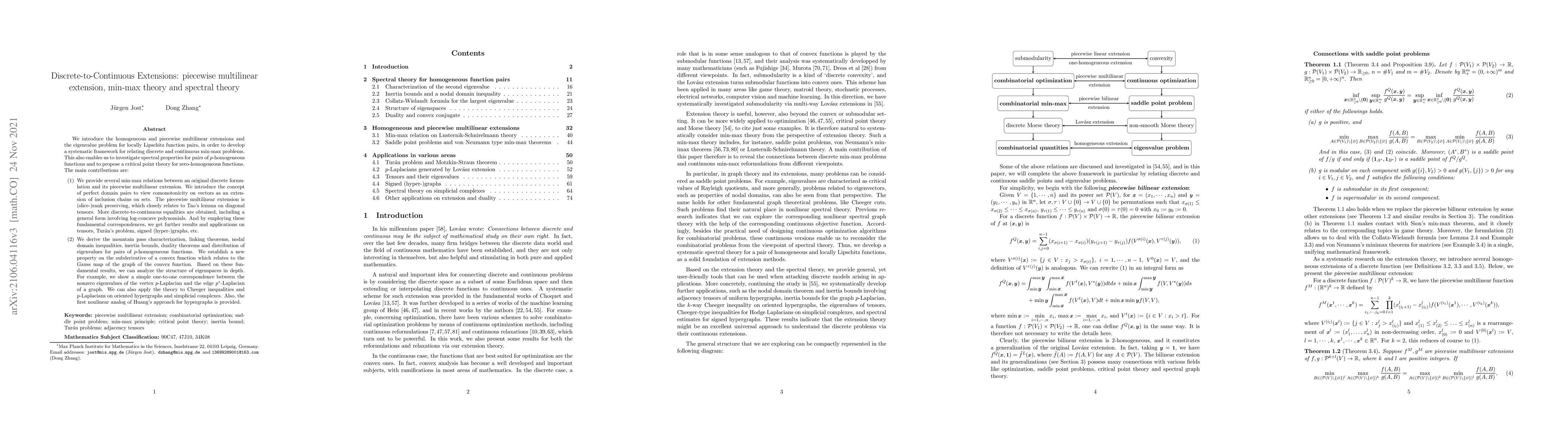 We introduce the homogeneous and piecewise multilinear extensions and the eigenvalue problem for locally Lipschitz function pairs, in order to develop a systematic framework for relating discrete and continuous min-max problems. This also enables us to investigate spectral properties for pairs of $p$-homogeneous functions and to propose a critical point theory for zero-homogeneous functions. The main contributions are: (1) We provide several min-max relations between an original discrete formulation and its piecewise multilinear extension. We introduce the concept of perfect domain pairs to view comonotonicity on vectors as an extension of inclusion chains on sets. The piecewise multi-linear extension is (slice-)rank preserving, which closely relates to Tao's lemma on diagonal tensors. More discrete-to-continuous equalities are obtained, including a general form involving log-concave polynomials. And by employing these fundamental correspondences, we get further results and applications on tensors, Tur\'an's problem, signed (hyper-)graphs, etc. (2) We derive the mountain pass characterization, linking theorems, nodal domain inequalities, inertia bounds, duality theorems and distribution of eigenvalues for pairs of $p$-homogeneous functions. We establish a new property on the subderivative of a convex function which relates to the Gauss map of the graph of the convex function. Based on these fundamental results, we can analyze the structure of eigenspaces in depth. For example, we show a simple one-to-one correspondence between the nonzero eigenvalues of the vertex p-Laplacian and the edge $p^*$-Laplacian of a graph. We also apply the theory to Cheeger inequalities and $p$-Laplacians on oriented hypergraphs and simplicial complexes. Also, the first nonlinear analog of Huang's approach for hypergraphs is provided.