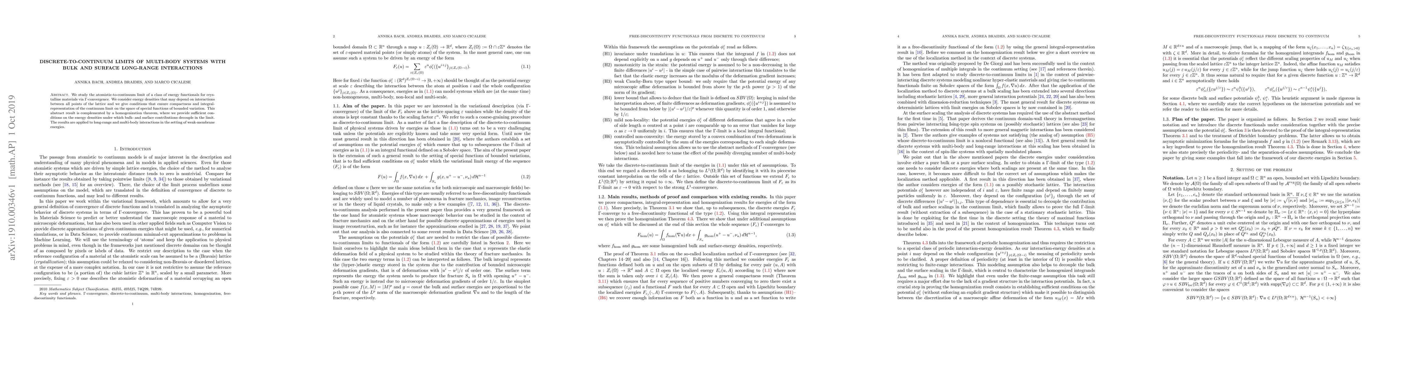 We study the atomistic-to-continuum limit of a class of energy functionals for crystalline materials via Gamma-convergence. We consider energy densities that may depend on interactions between all points of the lattice and we give conditions that ensure compactness and integral-representation of the continuum limit on the space of special functions of bounded variation. This abstract result is complemented by a homogenization theorem, where we provide sufficient conditions on the energy densities under which bulk- and surface contributions decouple in the limit. The results are applied to long-range and multi-body interactions in the setting of weak-membrane energies.