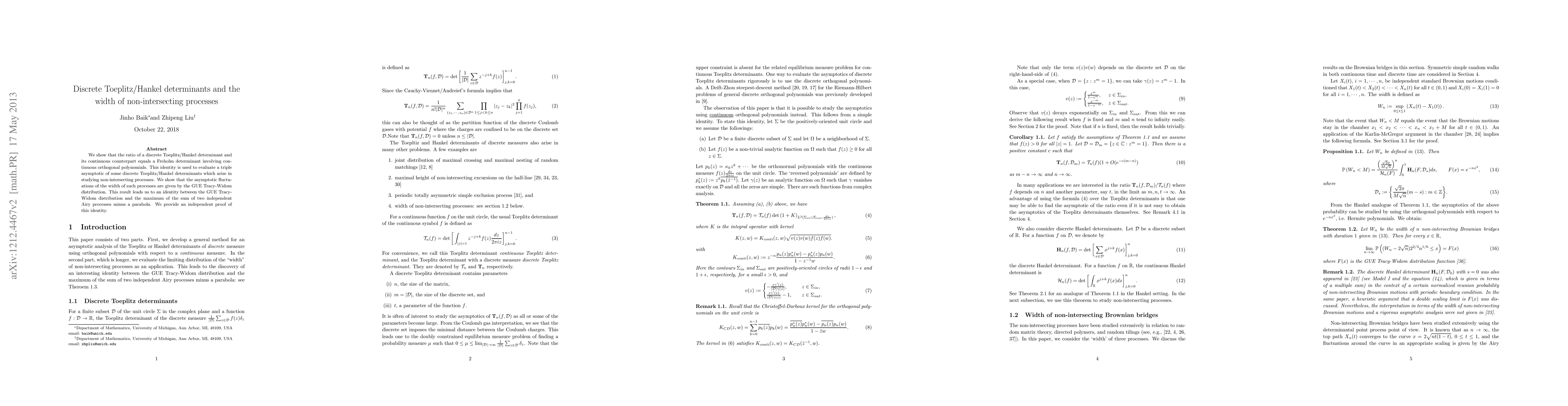 We show that the ratio of a discrete Toeplitz/Hankel determinant and its continuous counterpart equals a Freholm determinant involving continuous orthogonal polynomials. This identity is used to evaluate a triple asymptotic of some discrete Toeplitz/Hankel determinants which arise in studying non-intersecting processes. We show that the asymptotic fluctuations of the width of such processes are given by the GUE Tracy-Widom distribution. This result leads us to an identity between the GUE Tracy-Widom distribution and the maximum of the sum of two independent Airy processes minus a parabola. We provide an independent proof of this identity.