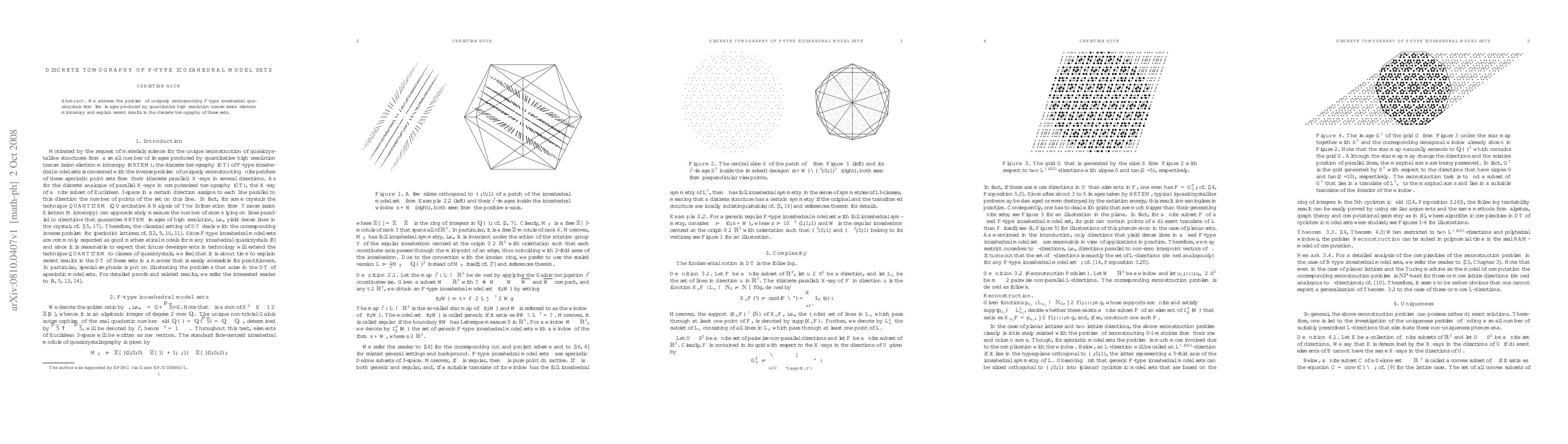 We address the problem of uniquely reconstructing F-type icosahedral quasicrystals from few images produced by quantitative high resolution transmission electron microscopy and explain recent results in the discrete tomography of these sets.
