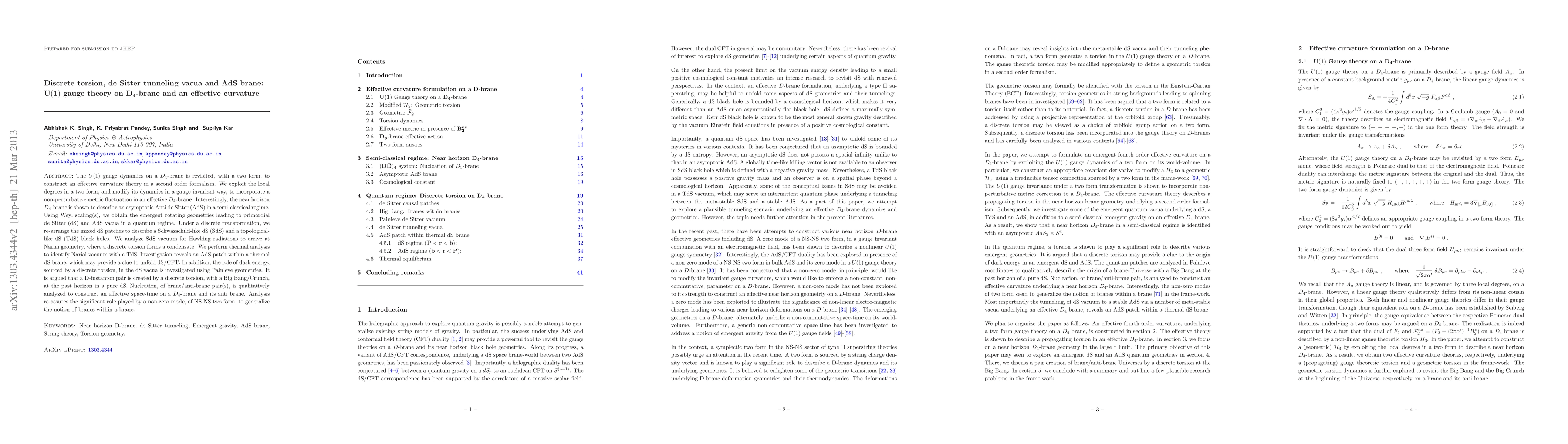 The U(1) gauge dynamics on a D4-brane is revisited, with a two form, to construct an effective curvature theory in a second order formalism. We exploit the local degrees in a two form, and modify its dynamics in a gauge invariant way, to incorporate a non-perturbative metric fluctuation in an effective D4-brane. Interestingly, the near horizon D4-brane is shown to describe an asymptotic Anti de Sitter (AdS) in a semi-classical regime. Using Weyl scaling(s), we obtain the emergent rotating geometries leading to primordial de Sitter (dS) and AdS vacua in a quantum regime. Under a discrete transformation, we re-arrange the mixed dS patches to describe a Schwazschild-like dS (SdS) and a topological-like dS (TdS) black holes. We analyze SdS vacuum for Hawking radiations to arrive at Nariai geometry, where a discrete torsion forms a condensate. We perform thermal analysis to identify Nariai vacuum with a TdS. Investigation reveals an AdS patch within a thermal dS brane, which may provide a clue to unfold dS/CFT. In addition, the role of dark energy, sourced by a discrete torsion, in the dS vacua is investigated using Painleve geometries. It is argued that a D-instanton pair is created by a discrete torsion, with a Big Bang/Crunch, at the past horizon in a pure dS. Nucleation, of brane/anti-brane pair(s), is qualitatively analyzed to construct an effective space-time on a D4-brane and its anti brane. Analysis re-assures the significant role played by a non-zero mode, of NS-NS two form, to generalize the notion of branes within a brane.