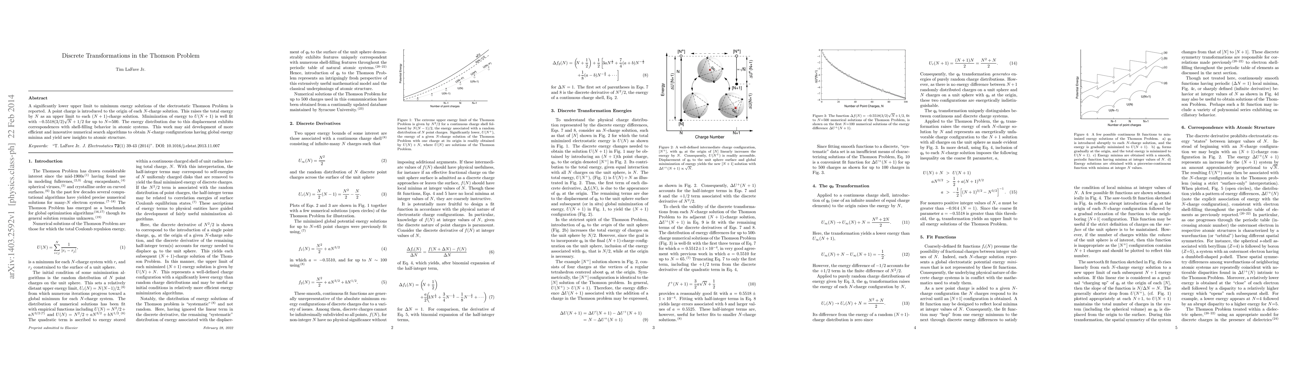 A significantly lower upper limit to minimum energy solutions of the electrostatic Thomson Problem is reported. A point charge is introduced to the origin of each $N$-charge solution. This raises the total energy by $N$ as an upper limit to each $(N+1)$-charge solution. Minimization of energy to $U(N+1)$ is well fit with $-0.5518(3/2)\sqrt N+1/2$ for up to $N=500$. The energy distribution due to this displacement exhibits correspondences with shell-filling behavior in atomic systems. This work may aid development of more efficient and innovative numerical search algorithms to obtain $N$-charge configurations having global energy minima and yield new insights to atomic structure.