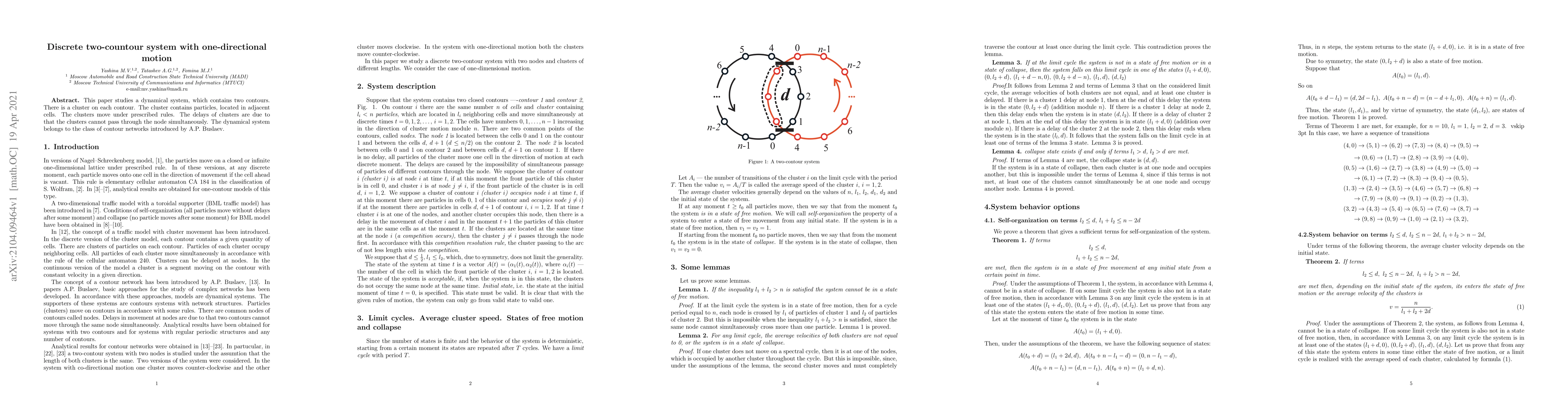 This paper studies a dynamical system, which contains two contours. There is a cluster on each contour. The cluster contains particles, located in adjacent cells. The clusters move under prescribed rules. The delays of clusters are due to that the clusters cannot pass through the node simultaneously. The dynamical system belongs to the class of contour networks introduced by A. P. Buslaev.