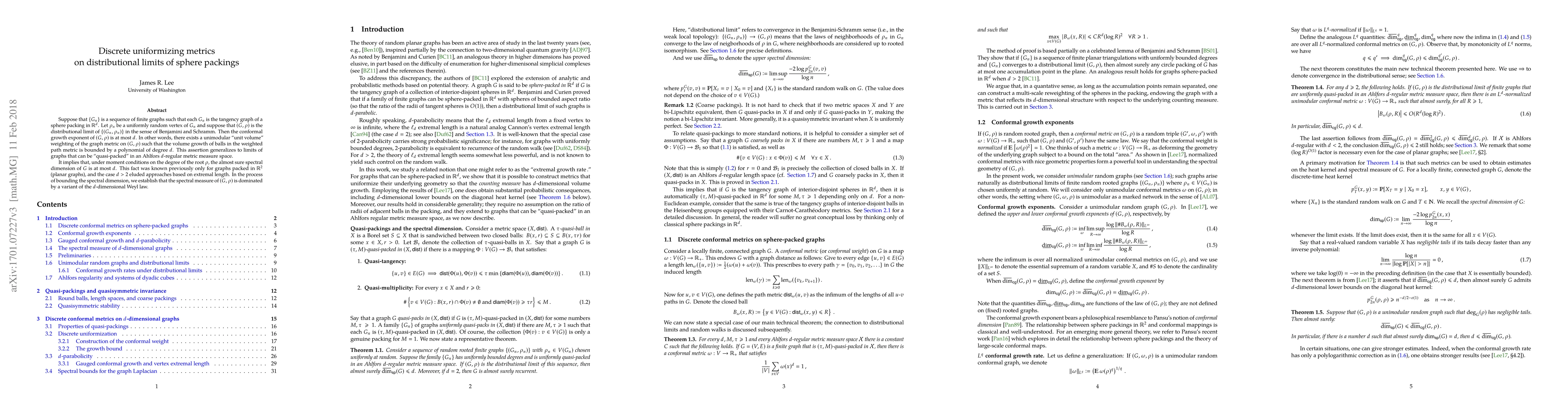 This paper investigates the conformal growth exponent of distributional limits of sphere packings represented as tangency graphs, showing it is bounded by the dimension $d$. It establishes a uniformizing metric with polynomial volume growth and deduces that the almost sure spectral dimension is also bounded by $d$, extending known results beyond planar graphs.