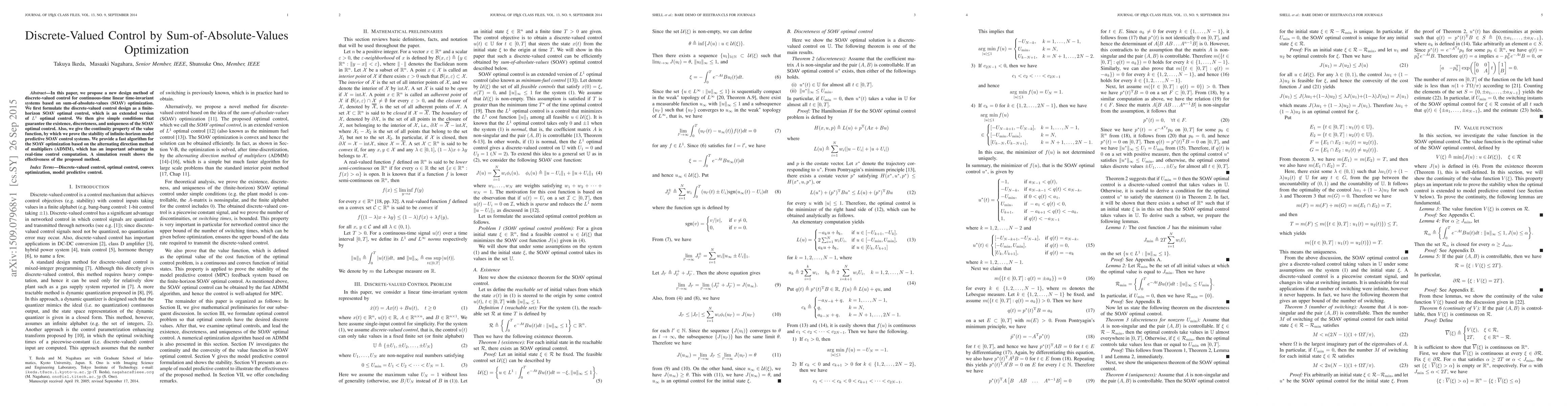 In this paper, we propose a new design method of discrete-valued control for continuous-time linear time-invariant systems based on sum-of-absolute-values (SOAV) optimization. We first formulate the discrete-valued control design as a finite-horizon SOAV optimal control, which is an extended version of L1 optimal control. We then give simple conditions that guarantee the existence, discreteness, and uniqueness of the SOAV optimal control. Also, we give the continuity property of the value function, by which we prove the stability of infinite-horizon model predictive SOAV control systems. We provide a fast algorithm for the SOAV optimization based on the alternating direction method of multipliers (ADMM), which has an important advantage in real-time control computation. A simulation result shows the effectiveness of the proposed method.