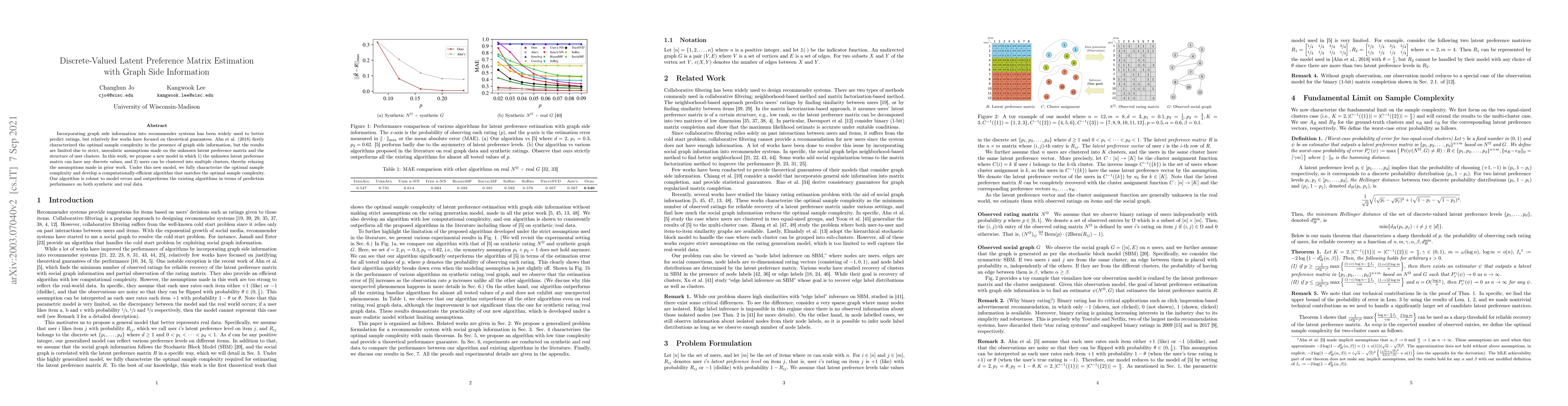 This paper proposes a new model for estimating a discrete-valued latent preference matrix that incorporates graph side information, relaxing previous assumptions. It characterizes optimal sample complexity and develops a computationally efficient algorithm that outperforms existing methods in both synthetic and real-world data.