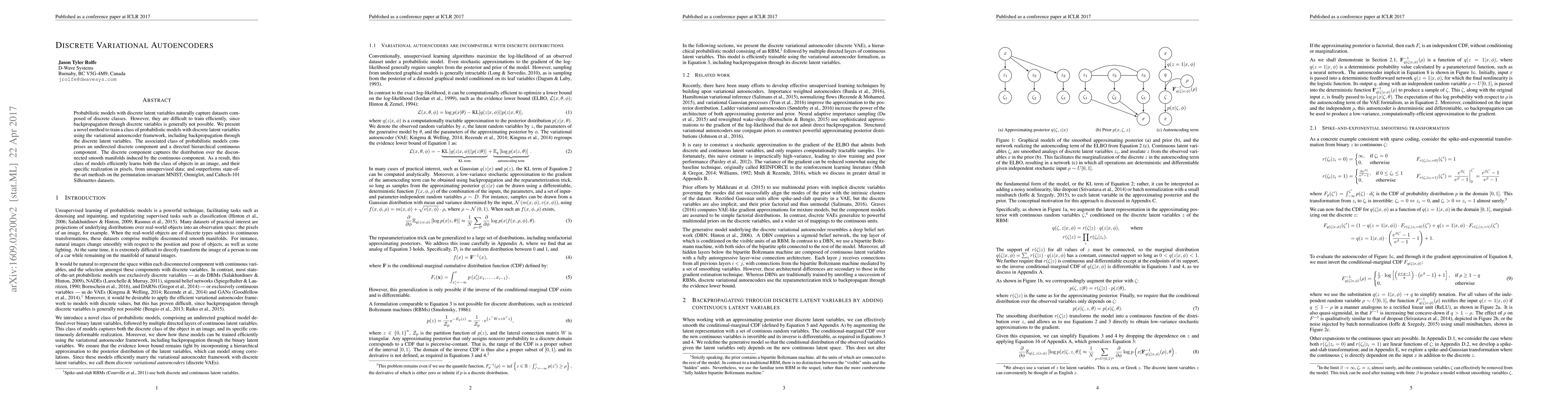 A new method trains probabilistic models with discrete latent variables using a variational autoencoder framework, enabling efficient learning from unsupervised data and outperforming state-of-the-art methods on several datasets.