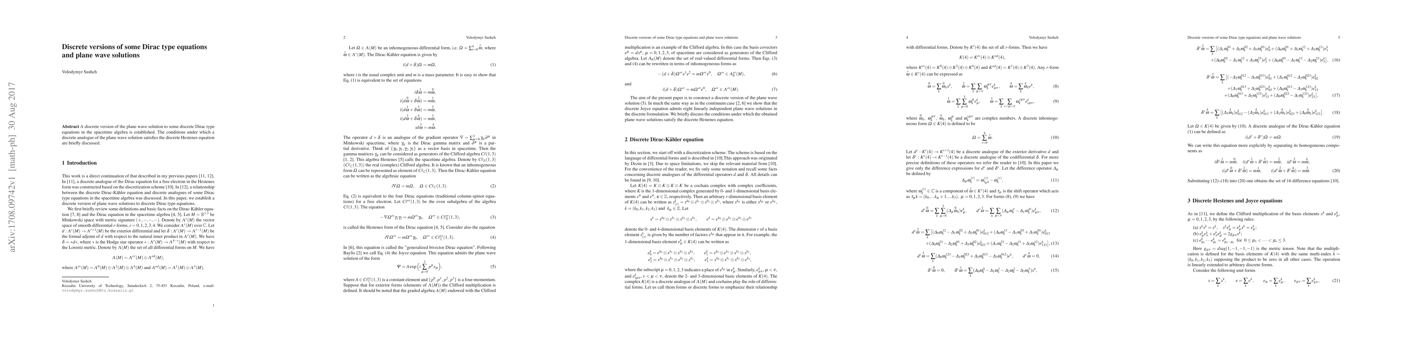 A discrete version of the plane wave solution to some discrete Dirac type equations in the spacetime algebra is established. The conditions under which a discrete analogue of the plane wave solution satisfies the discrete Hestenes equation are briefly discussed.