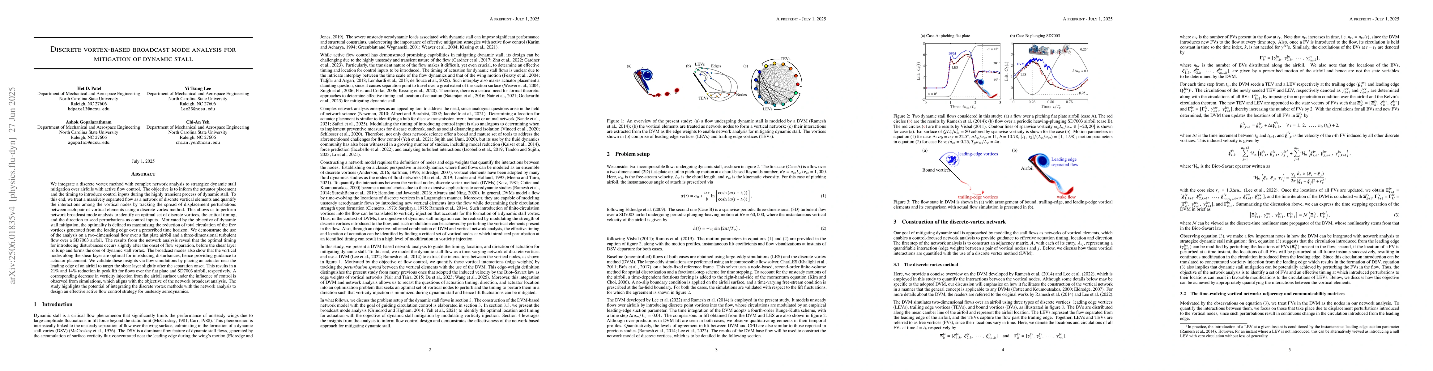 The research integrates a discrete vortex method with complex network analysis to strategize dynamic stall mitigation over a pitching airfoil using active flow control. It represents massively separated flows as a network of discrete vortical elements and uses displacement perturbation tracking to quantify vortical node interactions.