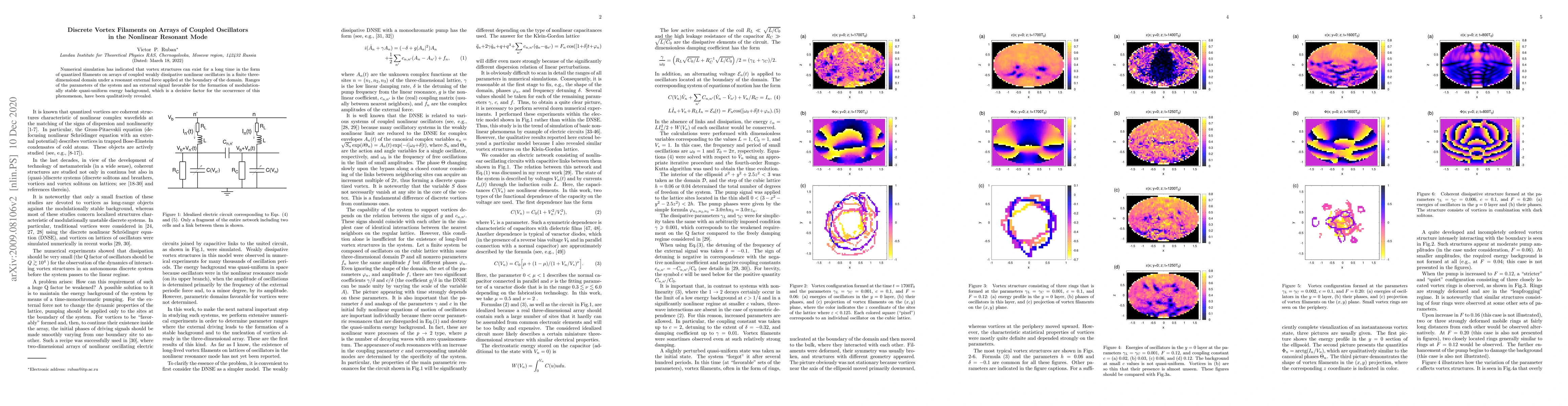 This paper explores the long-term existence of quantized vortex filaments in arrays of coupled oscillators under resonant external forces, revealing parameter ranges that support stable energy backgrounds crucial for this phenomenon. Numerical simulations demonstrate the formation of these vortex structures in a finite three-dimensional domain.
