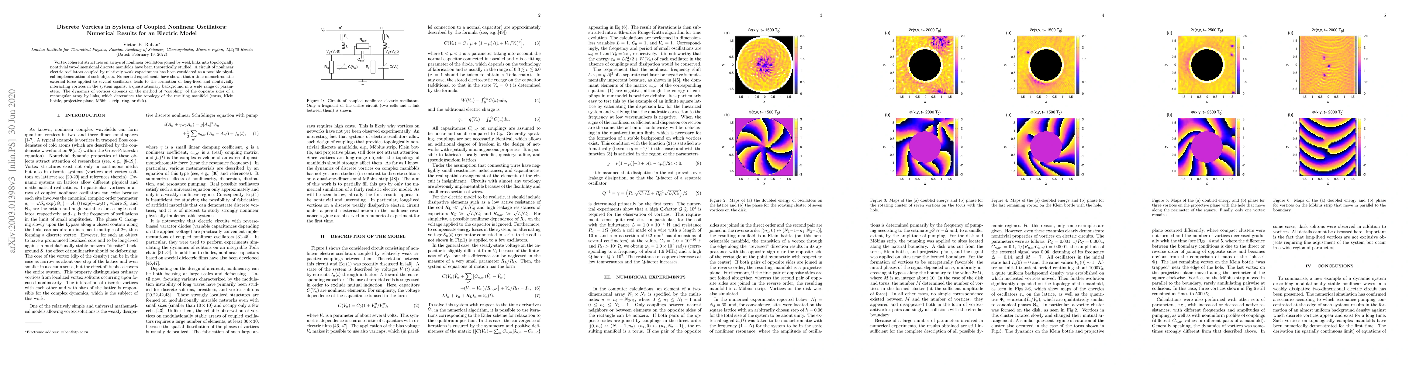 This research investigates vortex coherent structures in arrays of coupled nonlinear electric oscillators, demonstrating that external forces can create long-lived vortices with nontrivial interactions. The topology of the resulting manifold, determined by the coupling method, significantly influences vortex dynamics.