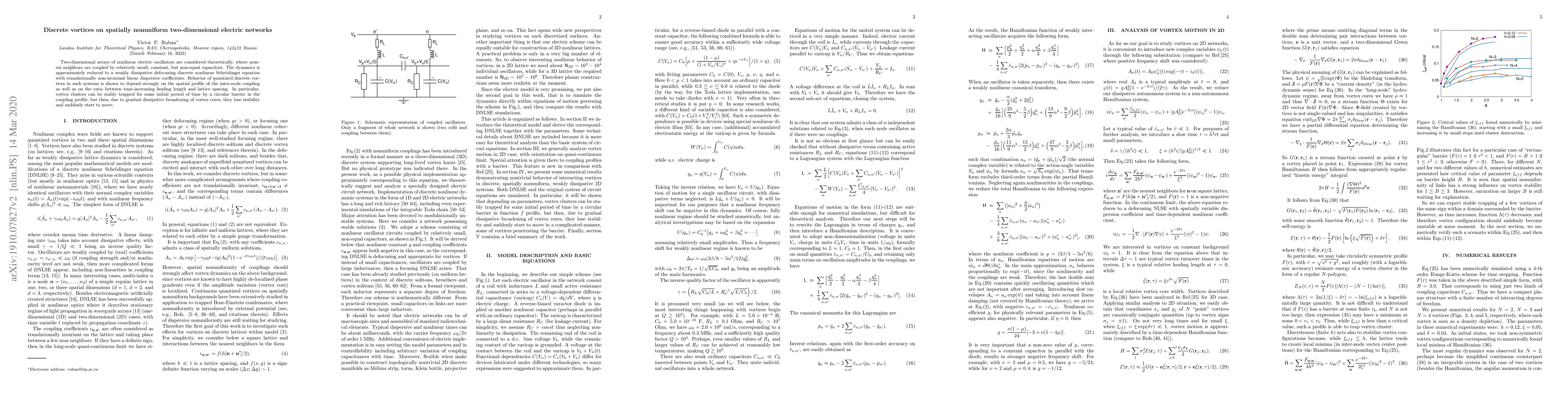 Two-dimensional arrays of nonlinear electric oscillators are considered theoretically, where nearest neighbors are coupled by relatively small, constant, but non-equal capacitors. The dynamics is approximately reduced to a weakly dissipative defocusing discrete nonlinear Schr\"odinger equation with translationally non-invariant linear dispersive coefficients. Behavior of quantized discrete vortices in such systems is shown to depend strongly on the spatial profile of the inter-node coupling as well as on the ratio between time-increasing healing length and lattice spacing. In particular, vortex clusters can be stably trapped for a some initial period of time by a circular barrier in the coupling profile, but then, due to gradual dissipative broadening of vortex cores, they lose stability and suddenly start to move.