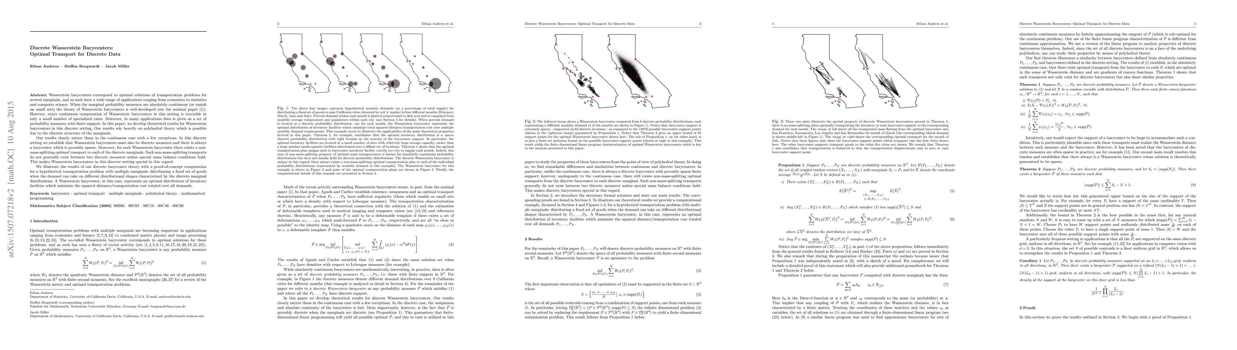 This paper develops theoretical results for Wasserstein barycenters in the discrete setting, showing that they must also be discrete measures and are provably sparse. It establishes the existence of non-mass-splitting optimal transport plans for discrete marginals, which is generally not possible without special conditions, and demonstrates the theory through a hypothetical transportation problem.