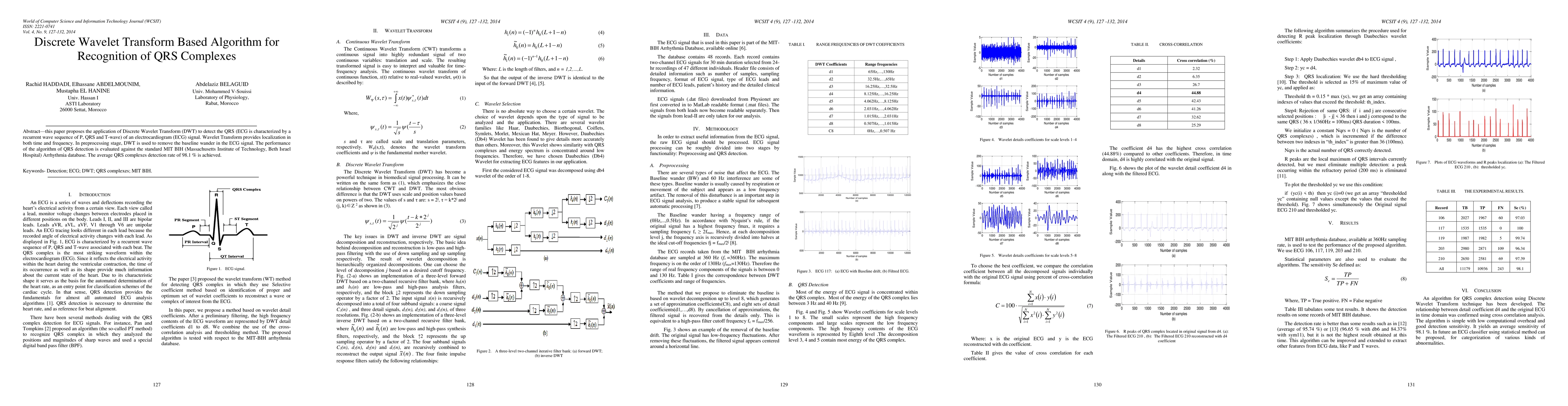 This paper introduces a Discrete Wavelet Transform (DWT) based algorithm for detecting QRS complexes in ECG signals, achieving a 98.1% detection rate. The DWT is utilized for baseline wander removal and offers time-frequency localization, evaluated against the MIT BIH Arrhythmia database.