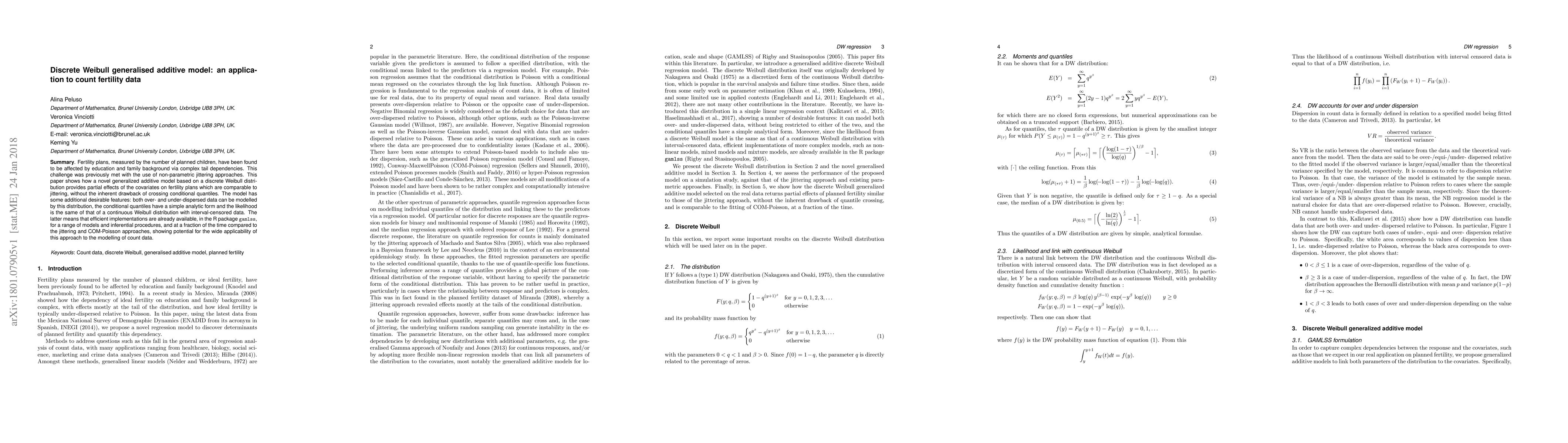 This paper introduces a novel discrete Weibull generalised additive model for count fertility data, offering comparable partial effects of covariates as non-parametric jittering but without the issue of crossing conditional quantiles. It leverages existing efficient implementations in the R package gamlss for faster computation.