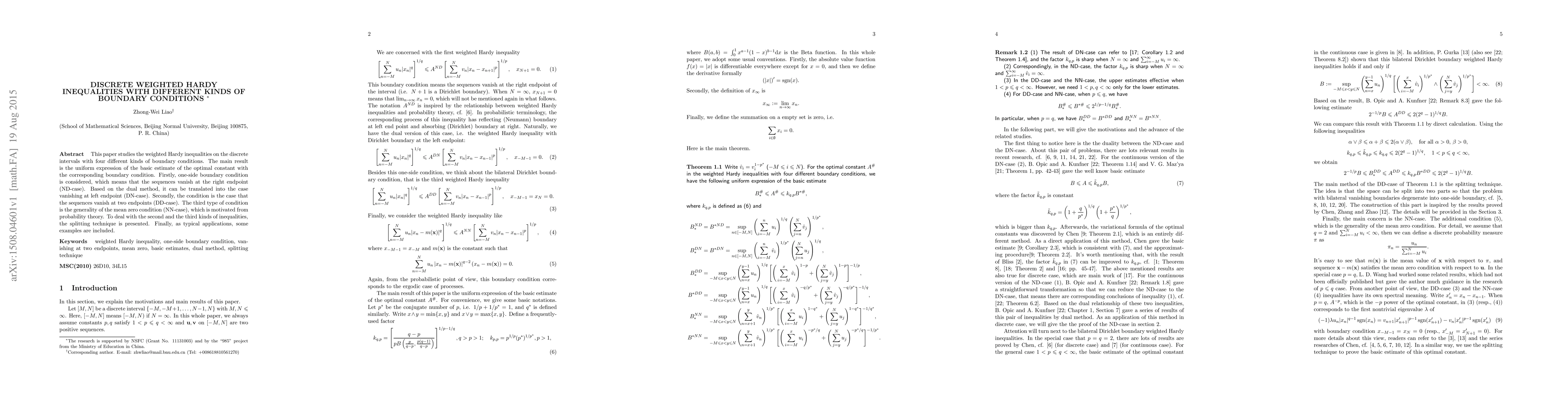 This paper studies the weighted Hardy inequalities on the discrete intervals with four different kinds of boundary conditions. The main result is the uniform expression of the basic estimate of the optimal constant with the corresponding boundary condition. Firstly, one-side boundary condition is considered, which means that the sequences vanish at the right endpoint (ND-case). Based on the dual method, it can be translated into the case vanishing at left endpoint (DN-case). Secondly, the condition is the case that the sequences vanish at two endpoints (DD-case). The third type of condition is the generality of the mean zero condition (NN-case), which is motivated from probability theory. To deal with the second and the third kinds of inequalities, the splitting technique is presented. Finally, as typical applications, some examples are included.