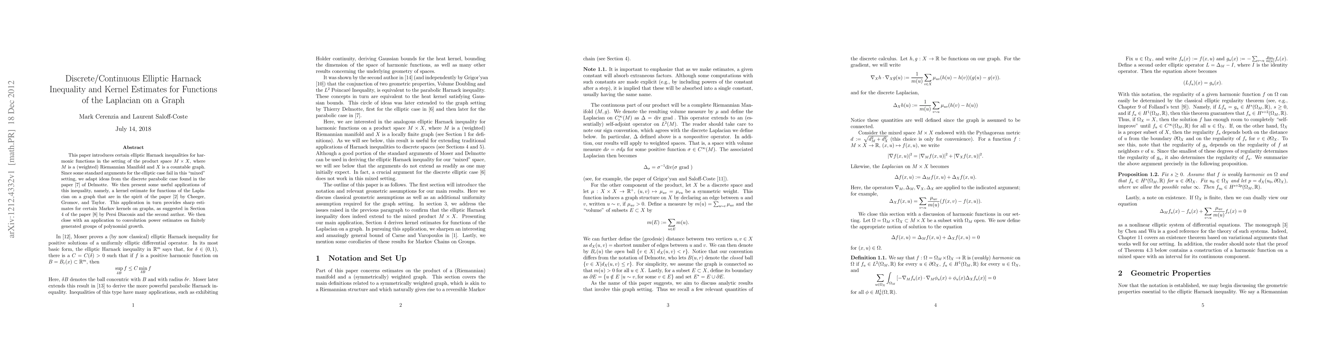 This paper presents elliptic Harnack inequalities for harmonic functions in a mixed setting of Riemannian Manifolds and countable graphs, adapting methods from the discrete parabolic case. It provides kernel estimates for functions of the Laplacian on graphs, leading to sharp estimates for Markov kernels and convolution power estimates on finitely generated groups of polynomial growth.