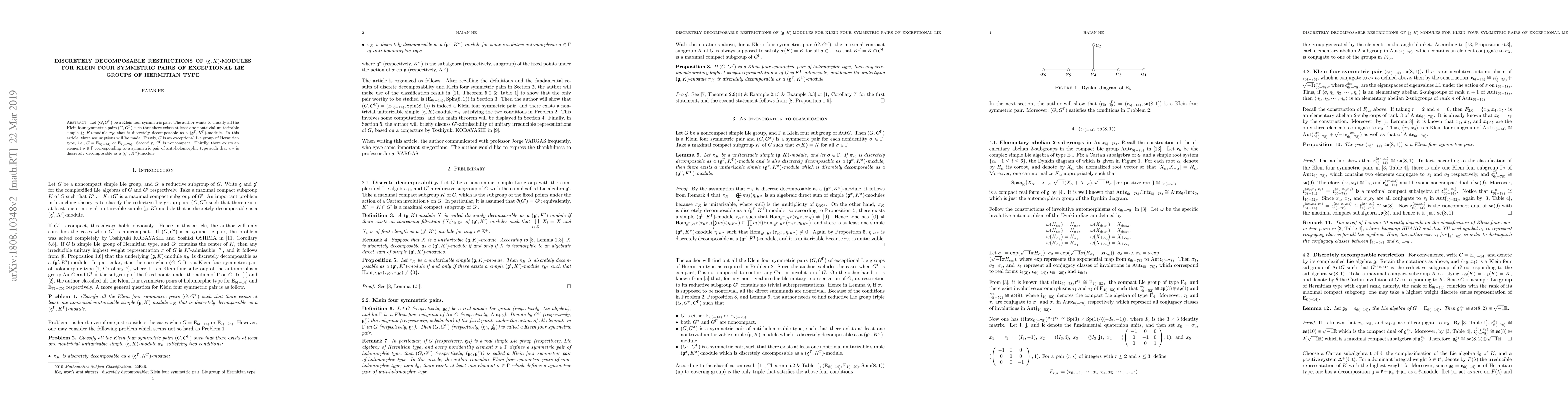 Let $(G,G^\Gamma)$ be a Klein four symmetric pair. The author wants to classify all the Klein four symmetric pairs $(G,G^\Gamma)$ such that there exists at least one nontrivial unitarizable simple $(\mathfrak{g},K)$-module $\pi_K$ that is discretely decomposable as a $(\mathfrak{g}^\Gamma,K^\Gamma)$-module. In this article, three assumptions will be made. Firstly, $G$ is an exceptional Lie group of Hermitian type, i.e., $G=\mathrm{E}_{6(-14)}$ or $\mathrm{E}_{7(-25)}$. Secondly, $G^\Gamma$ is noncompact. Thirdly, there exists an element $\sigma\in\Gamma$ corresponding to a symmetric pair of anti-holomorphic type such that $\pi_K$ is discretely decomposable as a $(\mathfrak{g}^\sigma,K^\sigma)$-module.