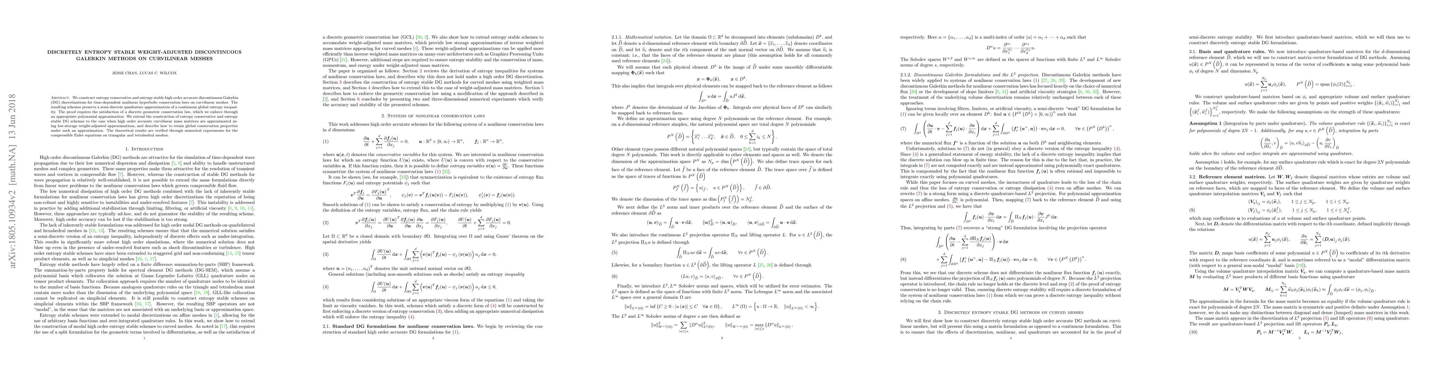The paper presents a novel approach for constructing entropy conservative and stable DG methods on curvilinear meshes using weight-adjusted mass matrices, ensuring global conservation properties.