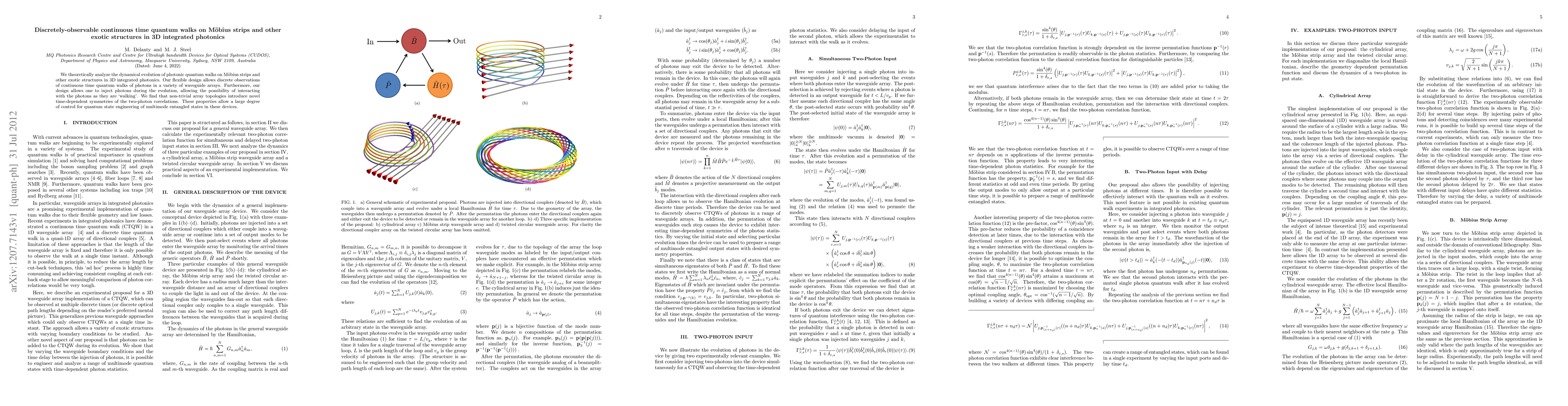 We theoretically analyze the dynamical evolution of photonic quantum walks on M\"obius strips and other exotic structures in 3D integrated photonics. Our flexible design allows discrete observations of continuous time quantum walks of photons in a variety of waveguide arrays. Furthermore, our design allows one to inject photons during the evolution, allowing the possibility of interacting with the photons as they are 'walking'. We find that non-trivial array topologies introduce novel time-dependent symmetries of the two-photon correlations. These properties allow a large degree of control for quantum state engineering of multimode entangled states in these devices.