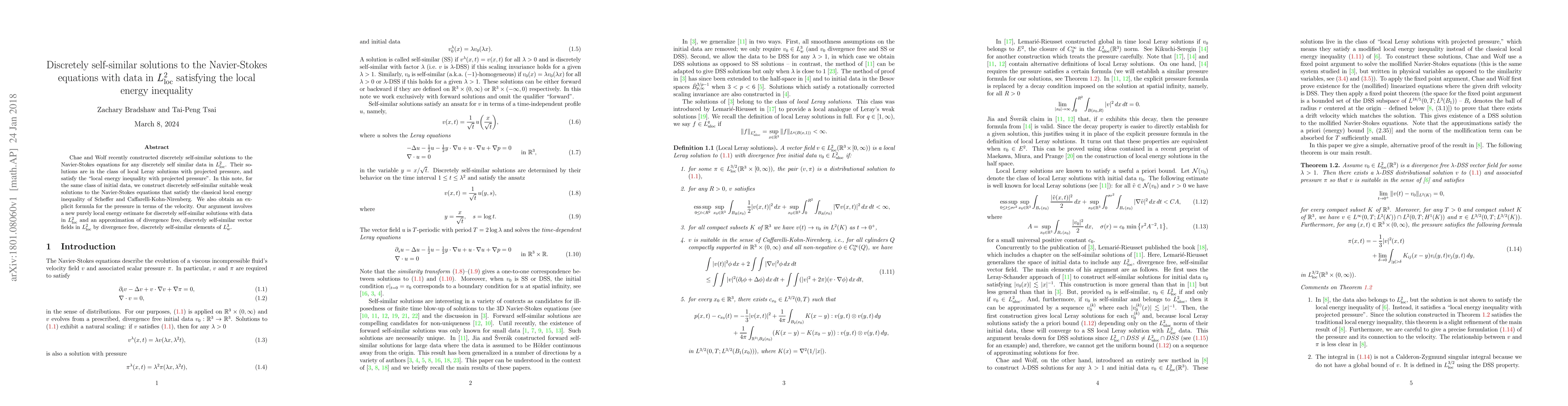 This paper constructs discretely self-similar suitable weak solutions to the Navier-Stokes equations for initial data in $L^2_{\mathrm{loc}}$ that satisfy the classical local energy inequality, and provides an explicit formula for the pressure in terms of the velocity. The authors utilize a new local energy estimate and an approximation technique for divergence-free vector fields.