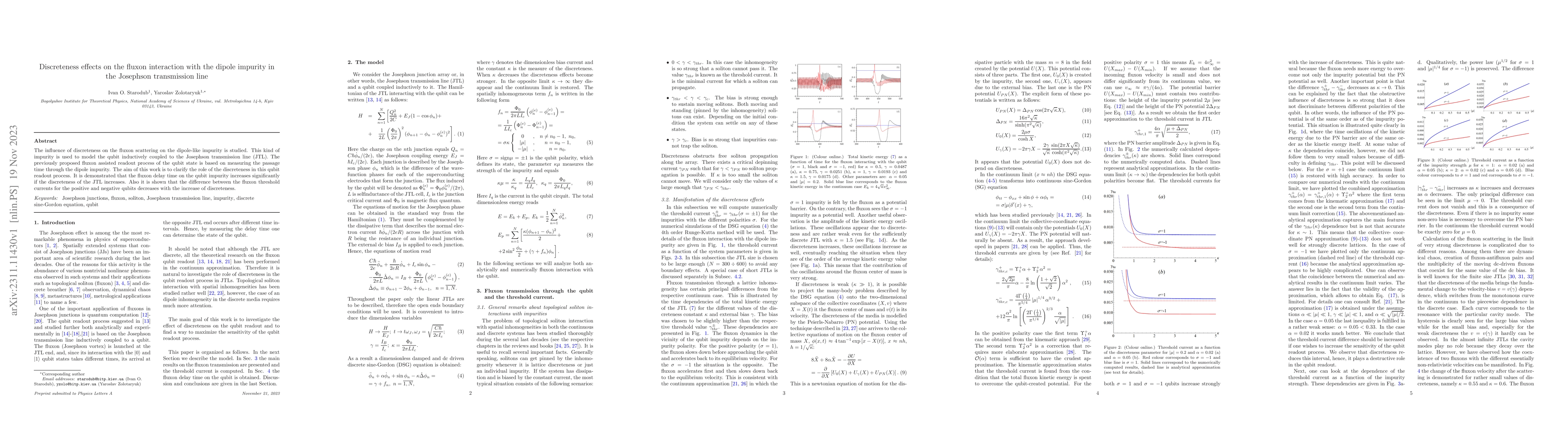 This paper explores the impact of discreteness in a Josephson transmission line on fluxon interactions with a dipole impurity, which models a coupled qubit. It finds that increased discreteness significantly raises the fluxon delay time and reduces the difference in threshold currents between positive and negative qubits.