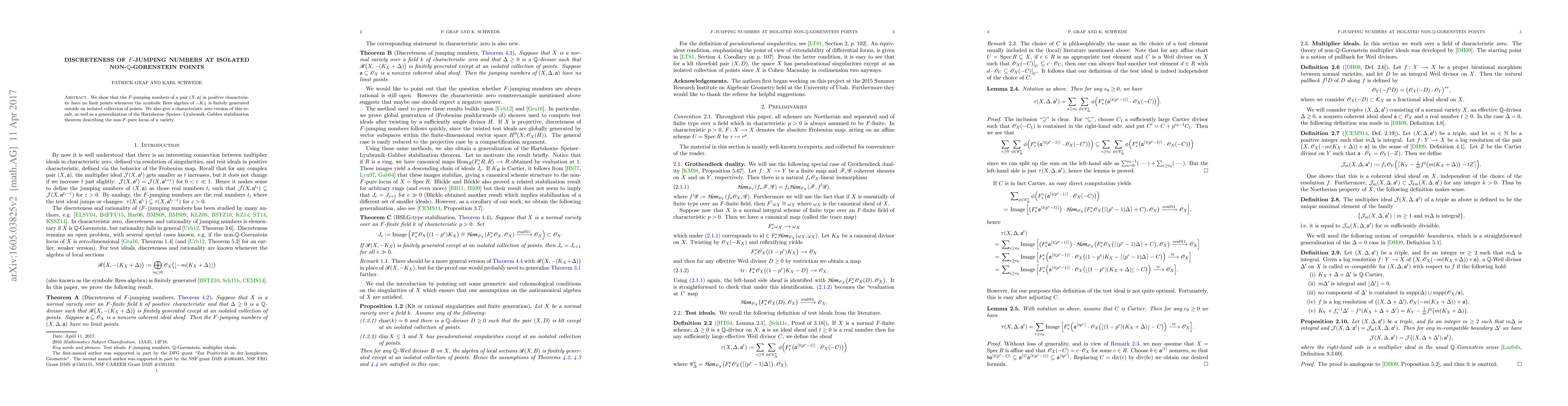 We show that the $F$-jumping numbers of a pair $(X, \mathfrak a)$ in positive characteristic have no limit points whenever the symbolic Rees algebra of $-K_X$ is finitely generated outside an isolated collection of points. We also give a characteristic zero version of this result, as well as a generalization of the Hartshorne-Speiser-Lyubeznik-Gabber stabilization theorem describing the non-$F$-pure locus of a variety.