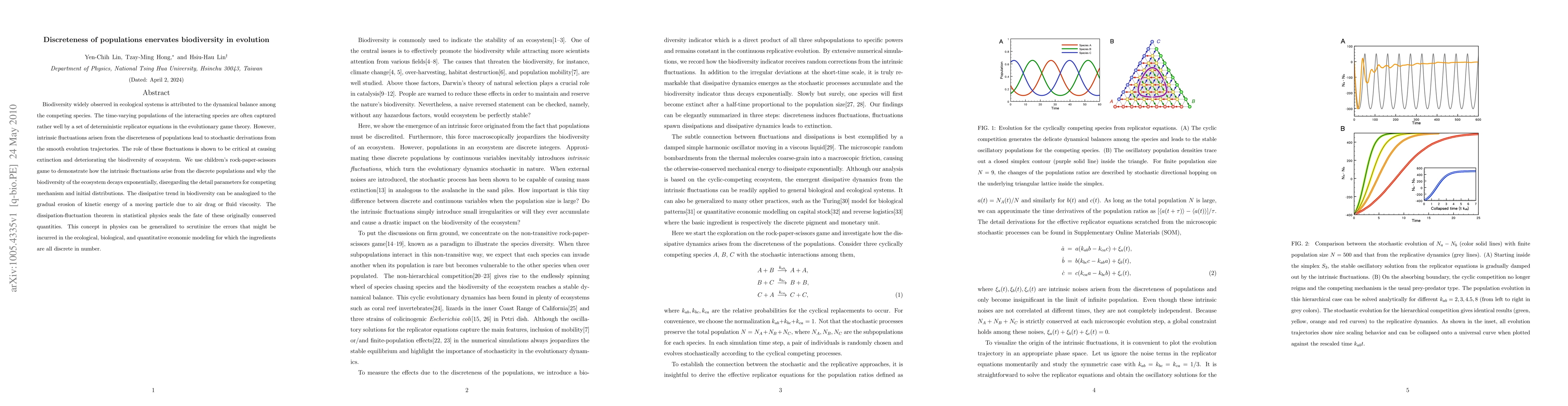 Biodiversity widely observed in ecological systems is attributed to the dynamical balance among the competing species. The time-varying populations of the interacting species are often captured rather well by a set of deterministic replicator equations in the evolutionary game theory. However, intrinsic fluctuations arisen from the discreteness of populations lead to stochastic derivations from the smooth evolution trajectories. The role of these fluctuations is shown to be critical at causing extinction and deteriorating the biodiversity of ecosystem. We use children's rock-paper-scissors game to demonstrate how the intrinsic fluctuations arise from the discrete populations and why the biodiversity of the ecosystem decays exponentially, disregarding the detail parameters for competing mechanism and initial distributions. The dissipative trend in biodiversity can be analogized to the gradual erosion of kinetic energy of a moving particle due to air drag or fluid viscosity. The dissipation-fluctuation theorem in statistical physics seals the fate of these originally conserved quantities. This concept in physics can be generalized to scrutinize the errors that might be incurred in the ecological, biological, and quantitative economic modeling for which the ingredients are all discrete in number.