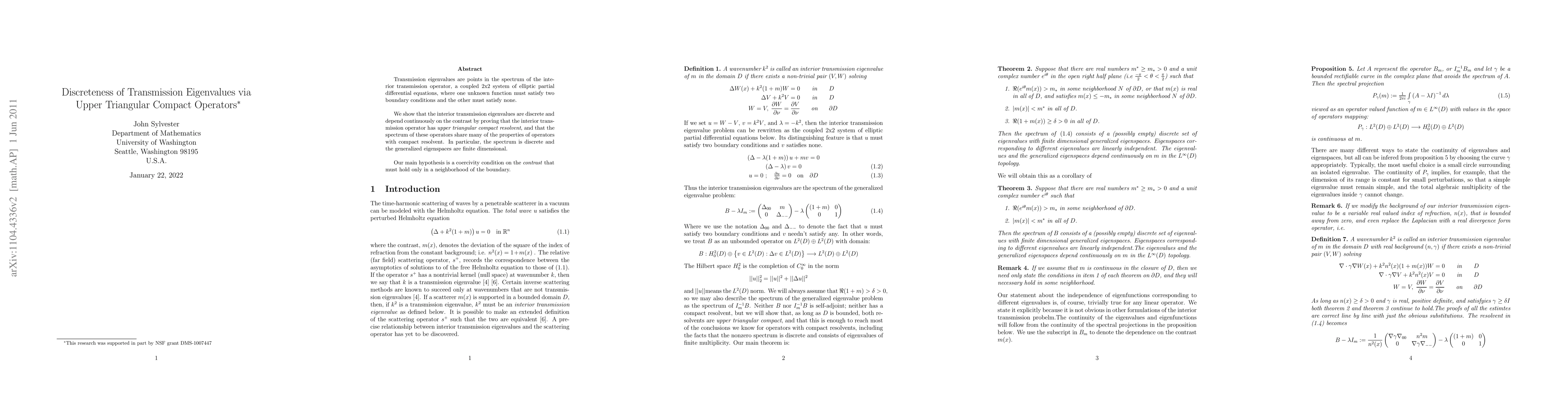 We show that the interior transmission eigenvalues are discrete by proving that the interior transmission operator has upper triangular compact resolvent, and that the spectrum of these operators share many of the properties of operators with compact resolvent. In particular, the spectrum is discrete and the generalized eigenspaces are finite dimensional. Our main hypothesis is a coercivity condition on the contrast that must hold only in a neighborhood of the boundary.