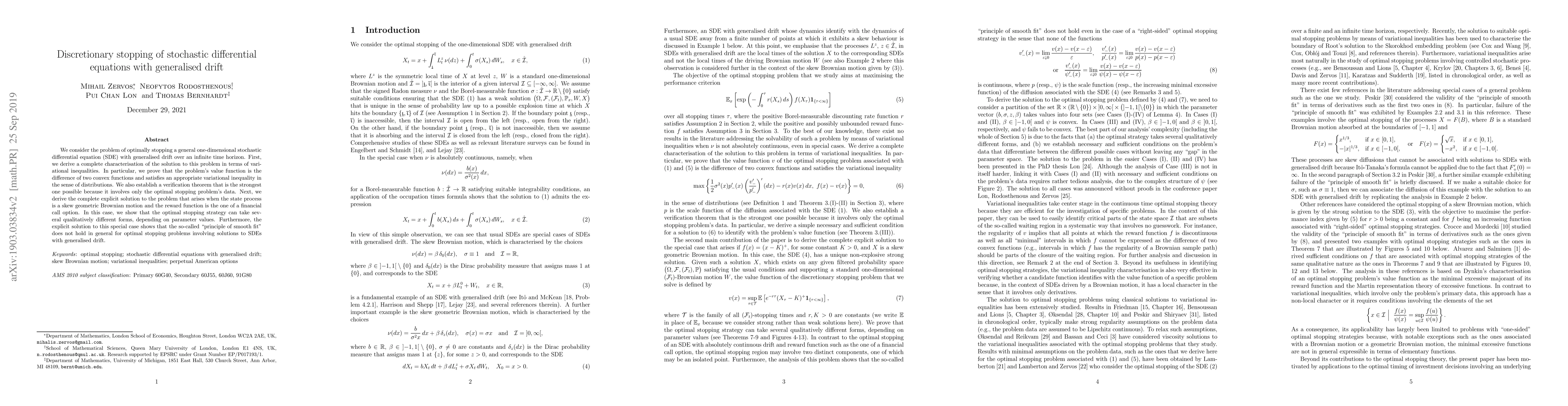 Researchers develop a new framework for optimally stopping stochastic differential equations with generalised drift, finding that the principle of smooth fit does not hold in this type of problem. The study provides a complete characterisation of solutions in terms of variational inequalities and derives explicit solutions for a specific financial case.