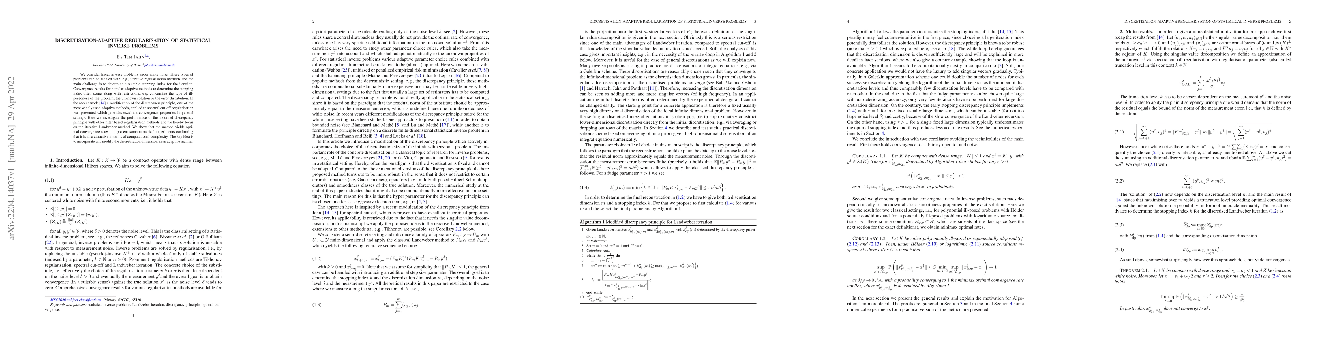 This paper explores the discretisation-adaptive regularisation of linear inverse problems under white noise, focusing on the modified discrepancy principle applied to the iterative Landweber method. It demonstrates optimal convergence rates and computational efficiency, highlighting the adaptive adjustment of discretisation dimensions.