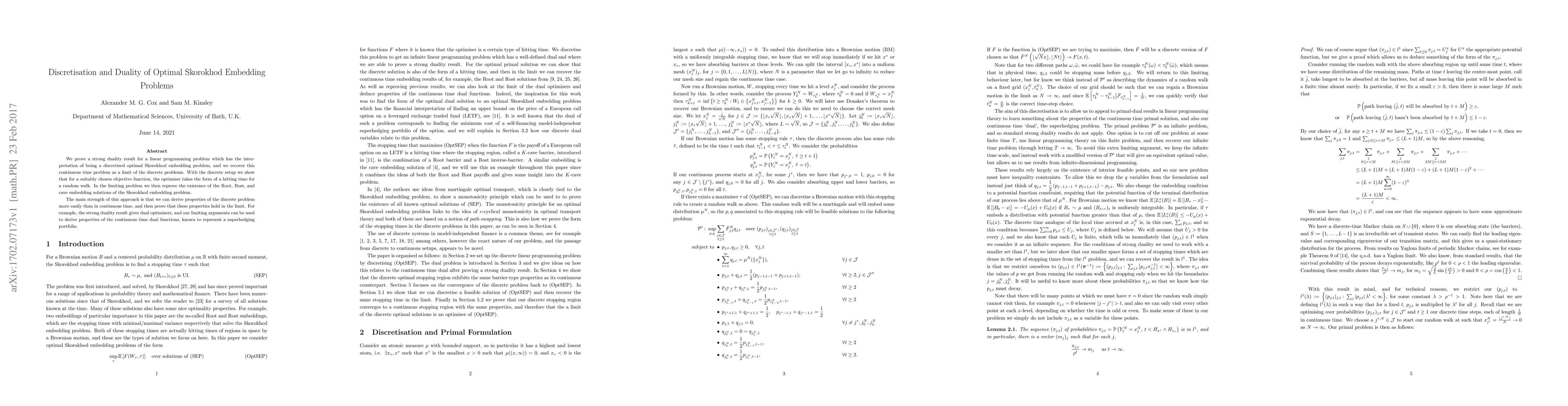 We prove a strong duality result for a linear programming problem which has the interpretation of being a discretised optimal Skorokhod embedding problem, and we recover this continuous time problem as a limit of the discrete problems. With the discrete setup we show that for a suitably chosen objective function, the optimiser takes the form of a hitting time for a random walk. In the limiting problem we then reprove the existence of the Root, Rost, and cave embedding solutions of the Skorokhod embedding problem. The main strength of this approach is that we can derive properties of the discrete problem more easily than in continuous time, and then prove that these properties hold in the limit. For example, the strong duality result gives dual optimisers, and our limiting arguments can be used to derive properties of the continuous time dual functions, known to represent a superhedging portfolio.
