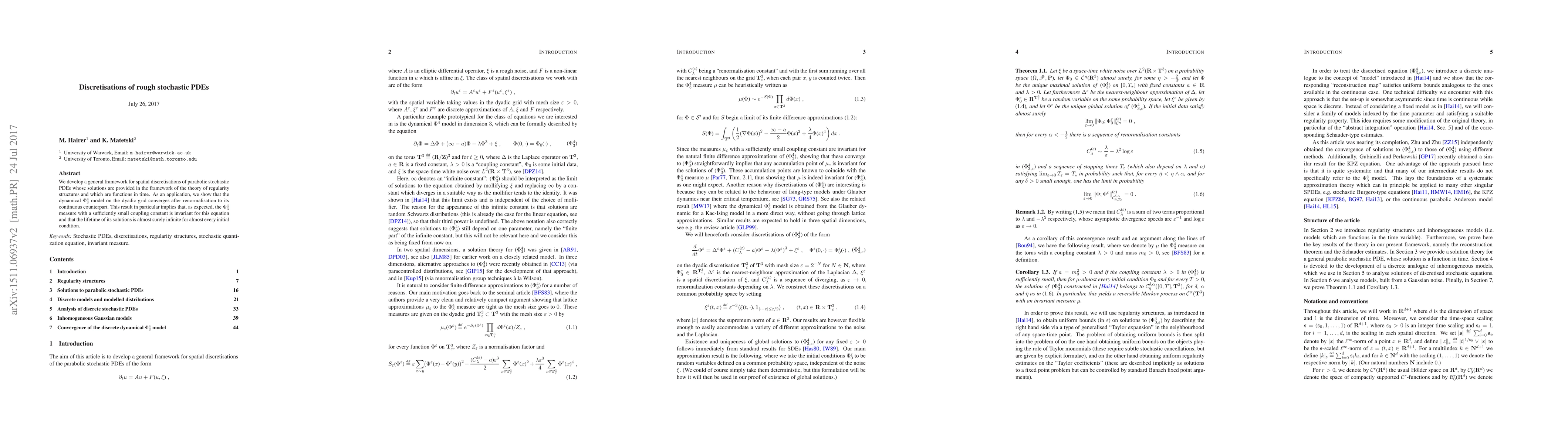 The paper develops a general framework for spatial discretisations of parabolic stochastic PDEs using regularity structures, focusing on the dynamical $\Phi^4_3$ model on the dyadic grid.