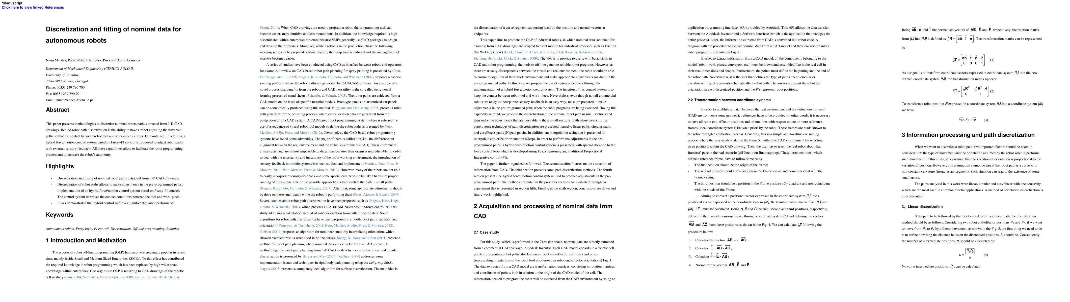 This paper presents methodologies to discretize nominal robot paths extracted from 3-D CAD drawings. Behind robot path discretization is the ability to have a robot adjusting the traversed paths so that the contact between robot tool and work-piece is properly maintained. In addition, a hybrid force/motion control system based on Fuzzy-PI control is proposed to adjust robot paths with external sensory feedback. All these capabilities allow to facilitate the robot programming process and to increase the robots autonomy.