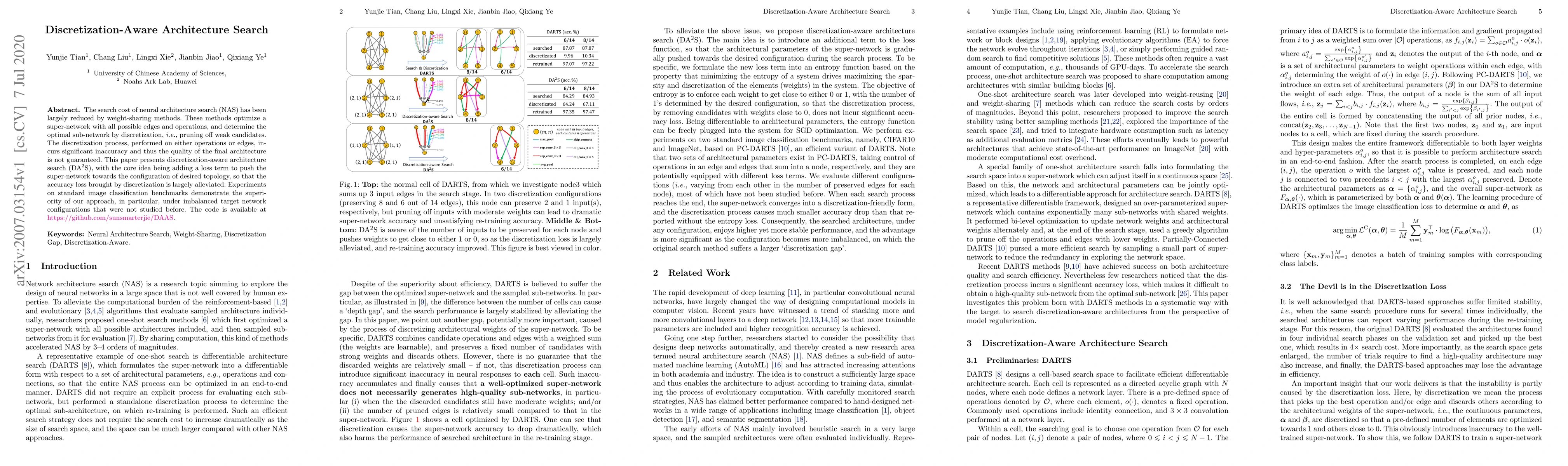 This paper introduces discretization-aware architecture search (DA²S) to improve neural architecture search by adding a loss term to guide the super-network towards the desired topology, thus mitigating accuracy loss from discretization. Experiments show its superior performance, especially for imbalanced target network configurations.