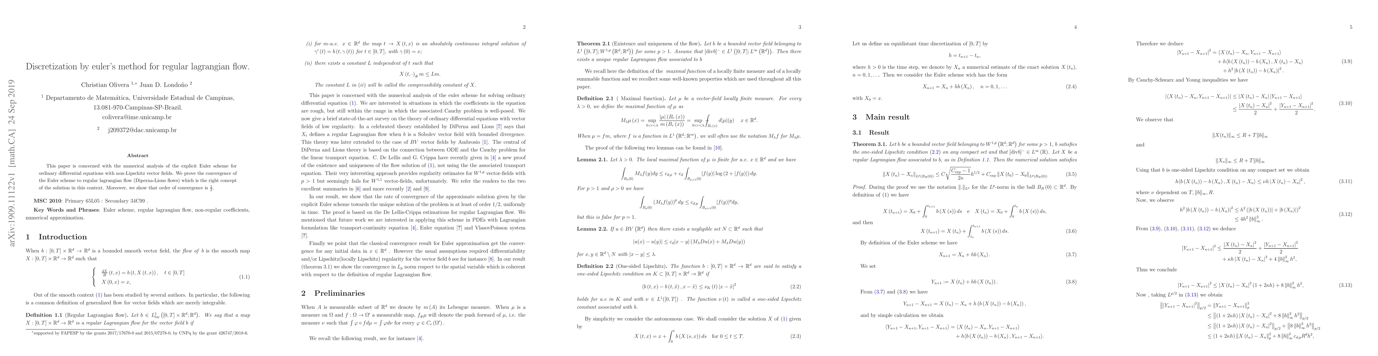This paper analyzes the explicit Euler method for solving ordinary differential equations with non-Lipschitz vector fields, proving its convergence to regular Lagrangian flows (Diperna-Lions flows) with a convergence order of $\frac{1}{2}$.