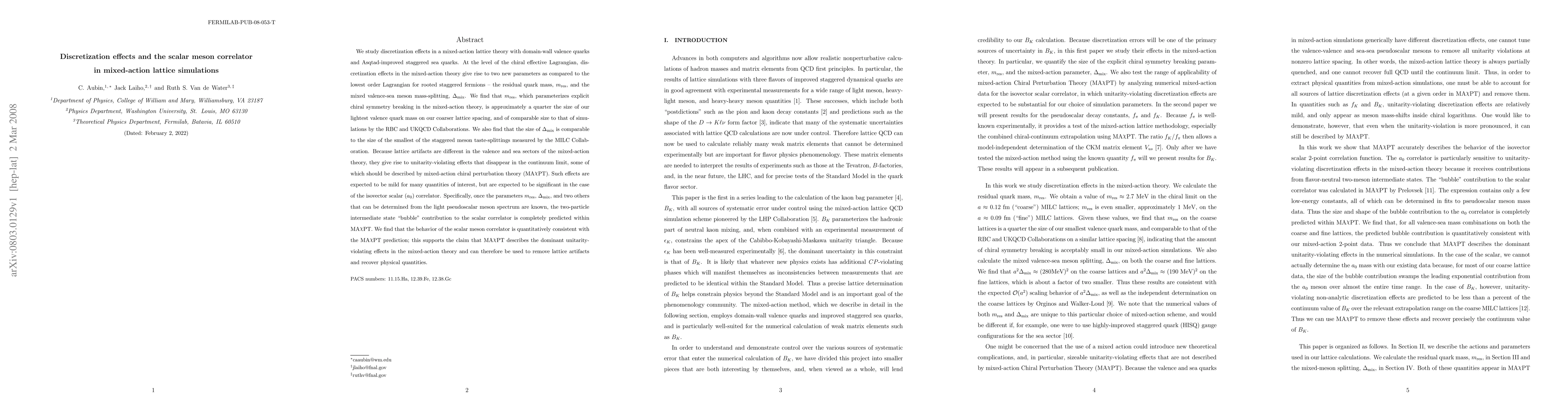 We study discretization effects in a mixed-action lattice theory with domain-wall valence quarks and Asqtad-improved staggered sea quarks. At the level of the chiral effective Lagrangian, discretization effects in the mixed-action theory give rise to two new parameters as compared to the lowest order Lagrangian for staggered fermions -- the residual quark mass, m_res, and the mixed valence-sea meson mass-splitting, Delta_mix. We find that the size of m_res is approximately four times smaller than our lightest valence quark mass on our coarser lattice spacing, and comparable to that of simulations by RBC and UKQCD. We also find that the size of Delta_mix is comparable to the smallest of the staggered meson taste-splittings measured by MILC. Because lattice artifacts are different in the valence and sea sectors of the mixed-action theory, they give rise to unitarity-violating effects that disappear in the continuum limit. Such effects are expected to be mild for many quantities of interest, but are significant in the case of the isovector scalar (a_0) correlator. Specifically, once m_res, Delta_mix, and two other parameters that can be determined from the light pseudoscalar spectrum are known, the two-particle intermediate state "bubble" contribution to the scalar correlator is completely predicted within mixed-action chiral perturbation theory (MAChPT). We find that the behavior of the scalar meson correlator is quantitatively consistent with the MAChPT prediction; this supports the claim that MAChPT describes the dominant unitarity-violating effects in the mixed-action theory and can be used to remove lattice artifacts and recover physical quantities.