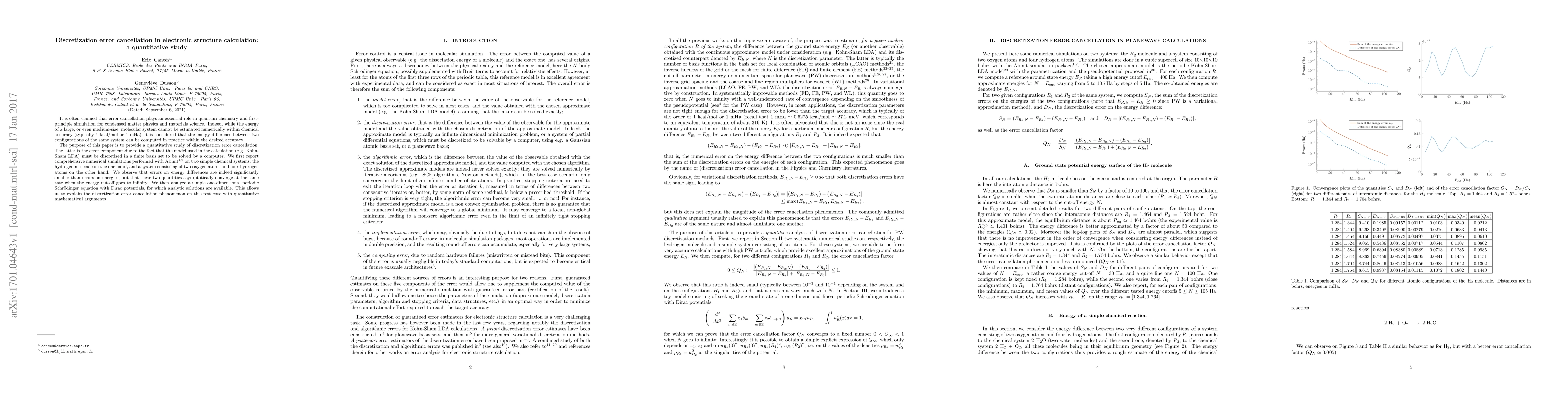 It is often claimed that error cancellation plays an essential role in quantum chemistry and first-principle simulation for condensed matter physics and materials science. Indeed, while the energy of a large, or even medium-size, molecular system cannot be estimated numerically within chemical accuracy (typically 1 kcal/mol or 1 mHa), it is considered that the energy difference between two configurations of the same system can be computed in practice within the desired accuracy. The purpose of this paper is to provide a quantitative study of discretization error cancellation. The latter is the error component due to the fact that the model used in the calculation (e.g. Kohn-Sham LDA) must be discretized in a finite basis set to be solved by a computer. We first report comprehensive numerical simulations performed with Abinit on two simple chemical systems, the hydrogen molecule on the one hand, and a system consisting of two oxygen atoms and four hydrogen atoms on the other hand. We observe that errors on energy differences are indeed significantly smaller than errors on energies, but that these two quantities asymptotically converge at the same rate when the energy cut-off goes to infinity. We then analyze a simple one-dimensional periodic Schr\"odinger equation with Dirac potentials, for which analytic solutions are available. This allows us to explain the discretization error cancellation phenomenon on this test case with quantitative mathematical arguments.