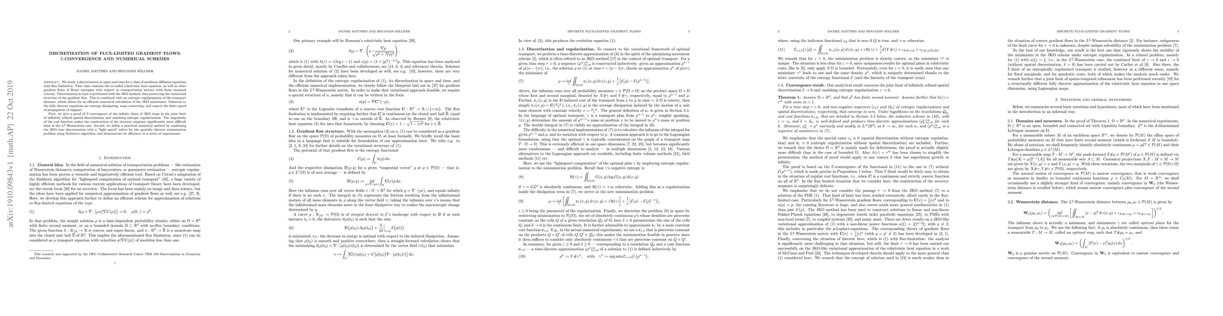 We study a discretization in space and time for a class of nonlinear diffusion equations with flux limitation. That class contains the so-called relativistic heat equation, as well as other gradient flows of Renyi entropies with respect to transportation metrics with finite maximal velocity. Discretization in time is performed with the JKO method, thus preserving the variational structure of the gradient flow. This is combined with an entropic regularization of the transport distance, which allows for an efficient numerical calculation of the JKO minimizers. Solutions to the fully discrete equations are entropy dissipating, mass conserving, and respect the finite speed of propagation of support. First, we give a proof of $\Gamma$-convergence of the infinite chain of JKO steps in the joint limit of infinitely refined spatial discretization and vanishing entropic regularization. The singularity of the cost function makes the construction of the recovery sequence significantly more difficult than in the $L^p$-Wasserstein case. Second, we define a practical numerical method by combining the JKO time discretization with a "light speed" solver for the spatially discrete minimization problem using Dykstra's algorithm, and demonstrate its efficiency in a series of experiments.