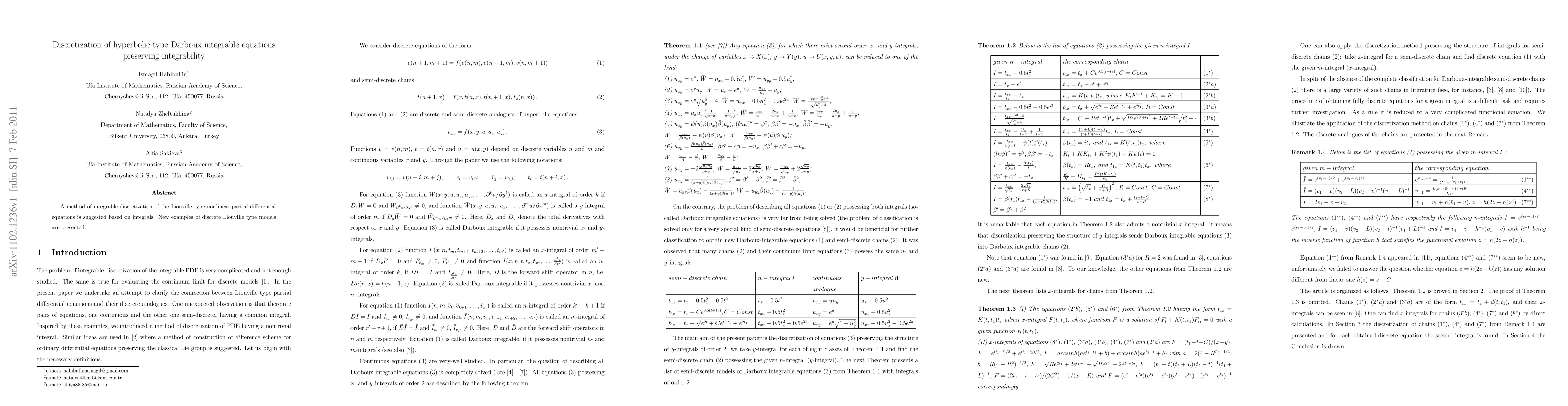 Summary: This paper proposes a method for discretizing hyperbolic type Darboux integrable equations while preserving their integrability. It introduces new discrete Liouville type models based on integral formulations.
