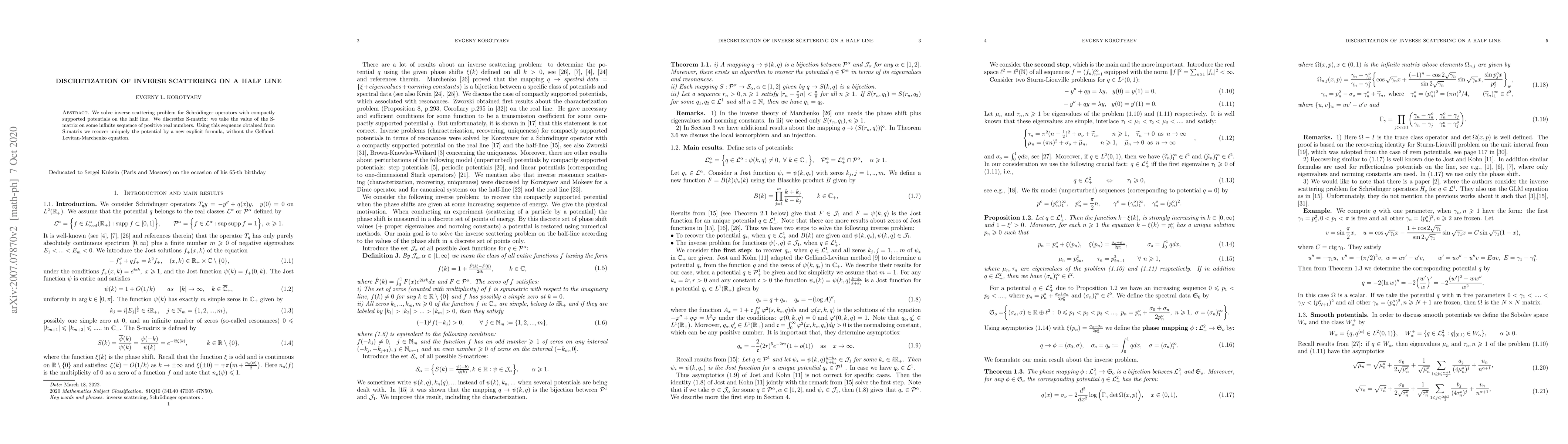 This paper addresses the inverse scattering problem for Schrödinger operators with compactly supported potentials on a half line. It proposes a novel discretization method for the S-matrix, enabling the unique recovery of the potential using an explicit formula, bypassing the traditional Gelfand-Levitan-Marchenko equation.