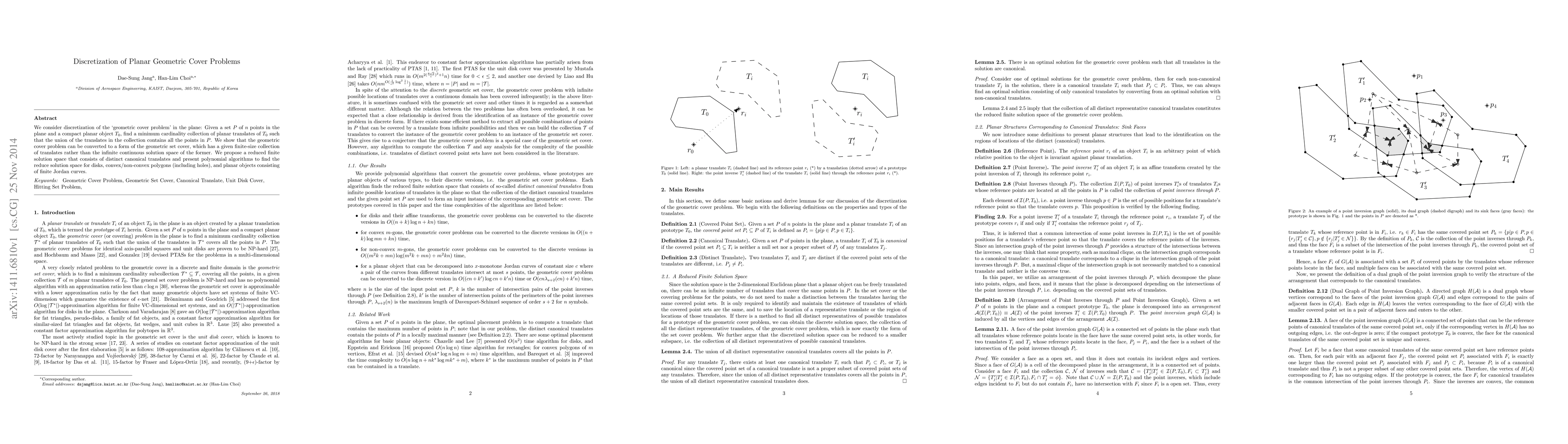 This paper addresses the discretization of the geometric cover problem in the plane, converting it into a geometric set cover problem with a finite collection of canonical translates. It proposes polynomial algorithms for finding optimal solutions for disks, polygons, and finite Jordan curves.