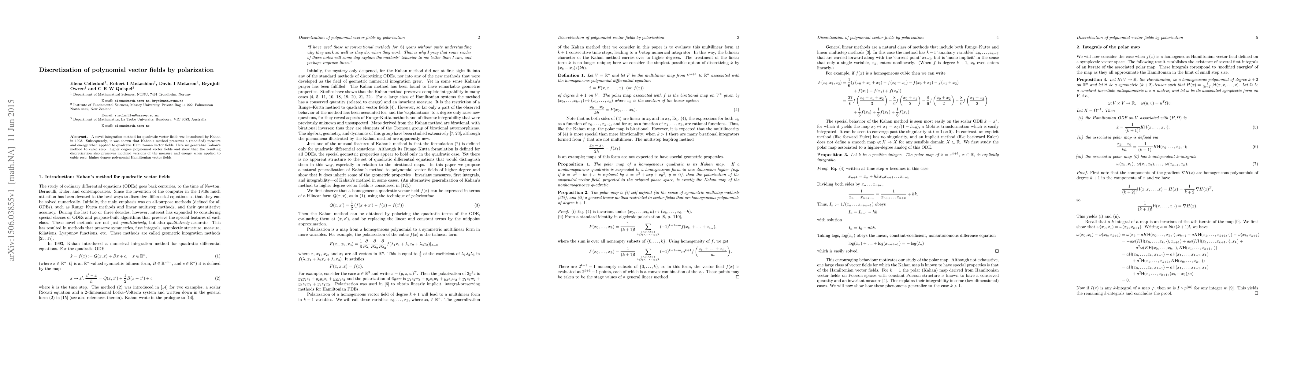 A novel integration method for quadratic vector fields was introduced by Kahan in 1993. Subsequently, it was shown that Kahan's method preserves a (modified) measure and energy when applied to quadratic Hamiltonian vector fields. Here we generalize Kahan's method to cubic resp. higher degree polynomial vector fields and show that the resulting discretization also preserves modified versions of the measure and energy when applied to cubic resp. higher degree polynomial Hamiltonian vector fields.