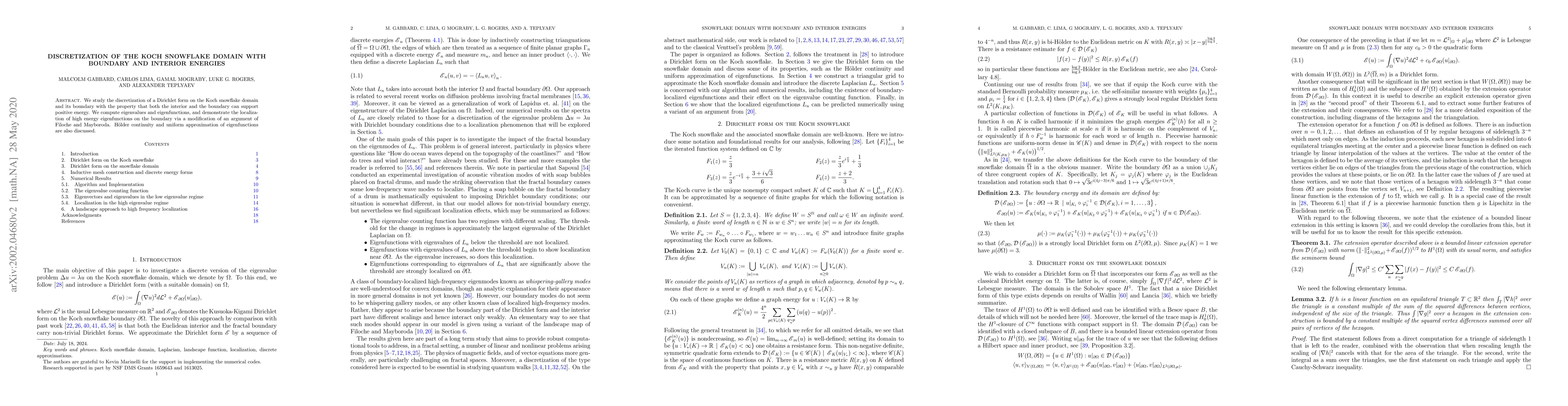 We study the discretization of a Dirichlet form on the Koch snowflake domain and its boundary with the property that both the interior and the boundary can support positive energy. We compute eigenvalues and eigenfunctions, and demonstrate the localization of high energy eigenfunctions on the boundary via a modification of an argument of Filoche and Mayboroda. H\"older continuity and uniform approximation of eigenfunctions are also discussed.