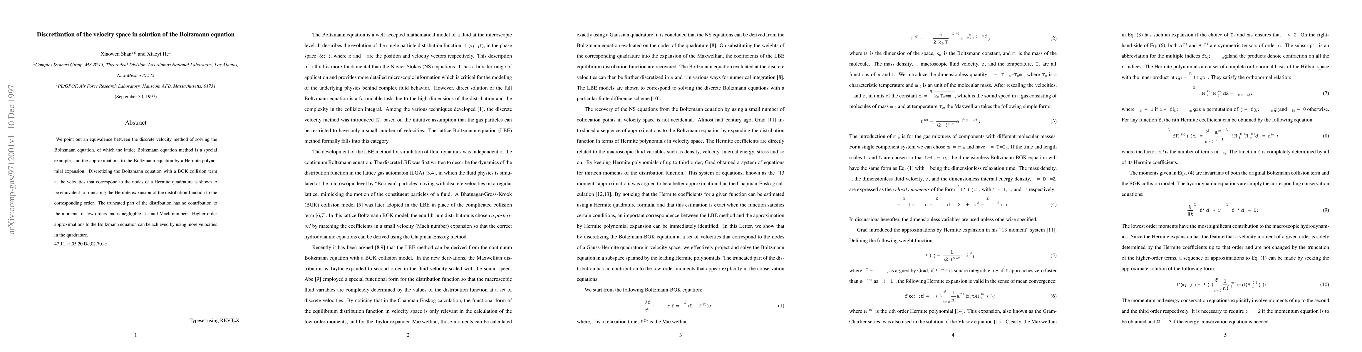 We point out an equivalence between the discrete velocity method of solving the Boltzmann equation, of which the lattice Boltzmann equation method is a special example, and the approximations to the Boltzmann equation by a Hermite polynomial expansion. Discretizing the Boltzmann equation with a BGK collision term at the velocities that correspond to the nodes of a Hermite quadrature is shown to be equivalent to truncating the Hermite expansion of the distribution function to the corresponding order. The truncated part of the distribution has no contribution to the moments of low orders and is negligible at small Mach numbers. Higher order approximations to the Boltzmann equation can be achieved by using more velocities in the quadrature.