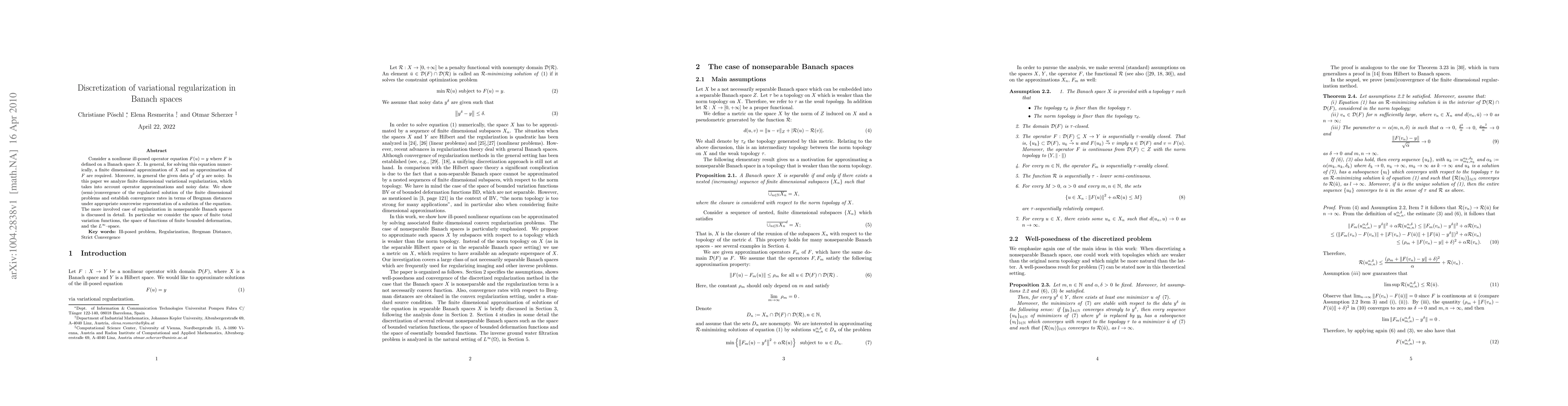 This paper explores the discretization of variational regularization for solving nonlinear ill-posed operator equations in Banach spaces, focusing on finite dimensional approximations and noisy data. It demonstrates (semi-)convergence of the regularized solution and establishes convergence rates using Bregman distances, with a detailed discussion on regularization in nonseparable Banach spaces.